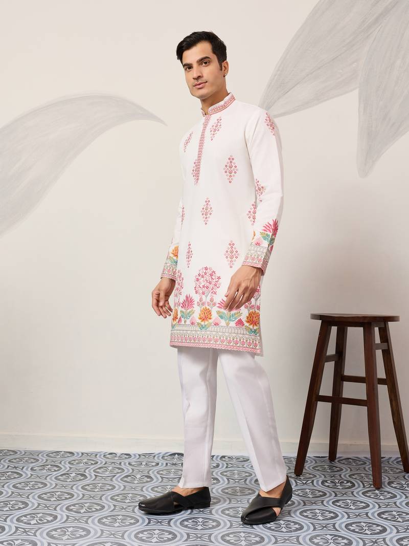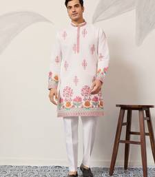 White viscose silk thread & sequins embroidered work wedding festival marriage party wear straight mens kurta
