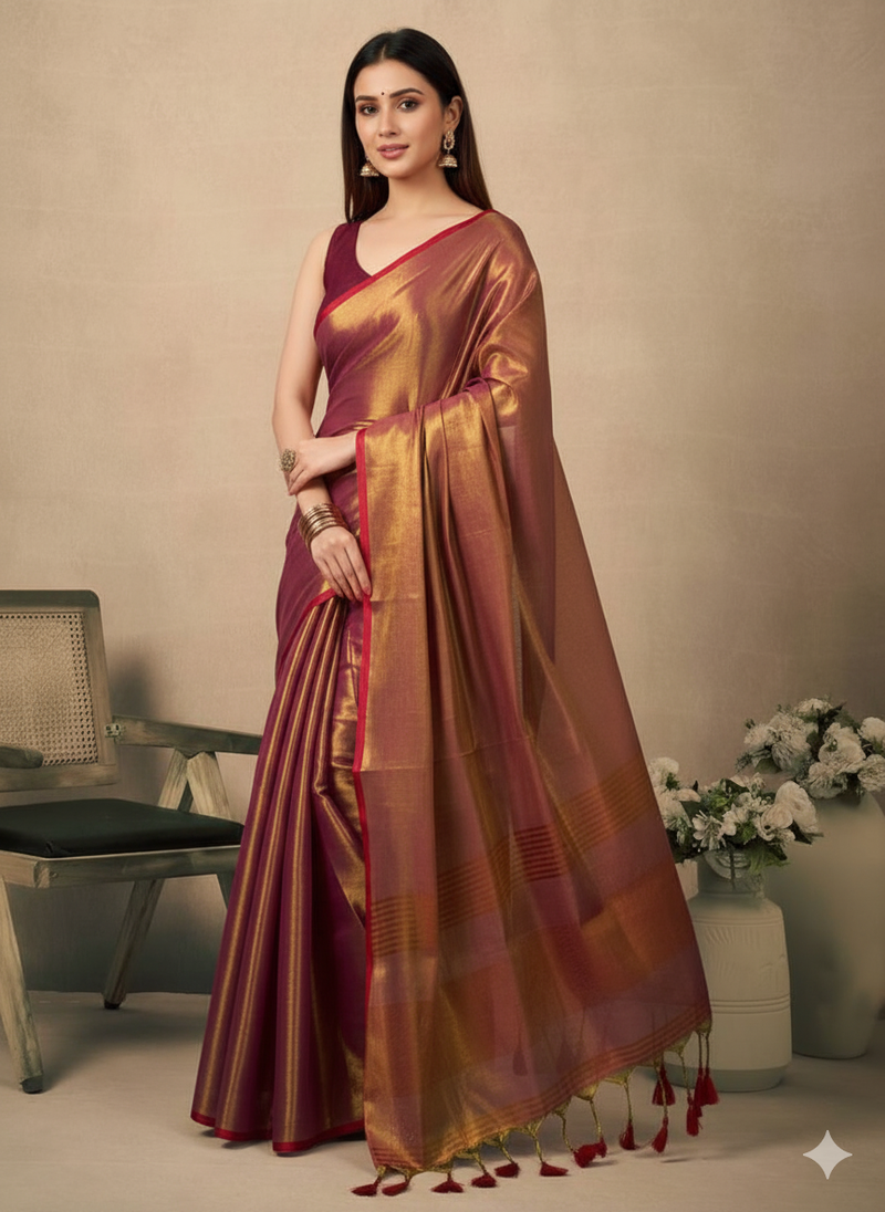 Margenta contrast weave pallu tissue silk blend saree with lining blouse