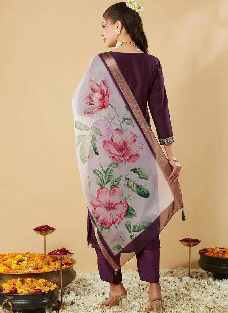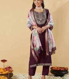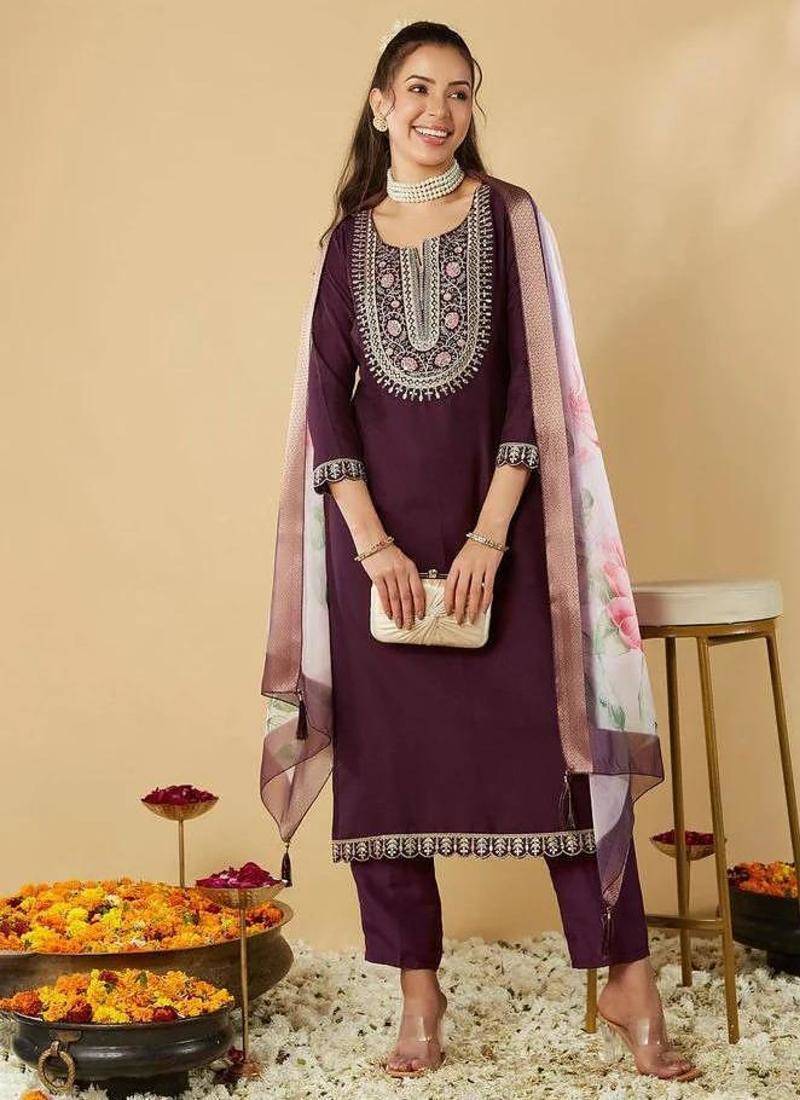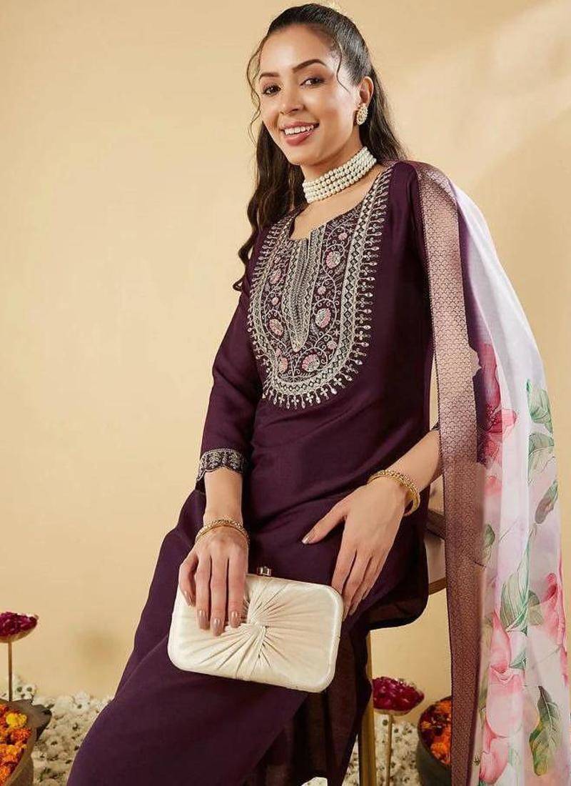 | Product Name | Wine Chanderi Silk Embroidered Straight Kurta Pant And Dupatta Set | |