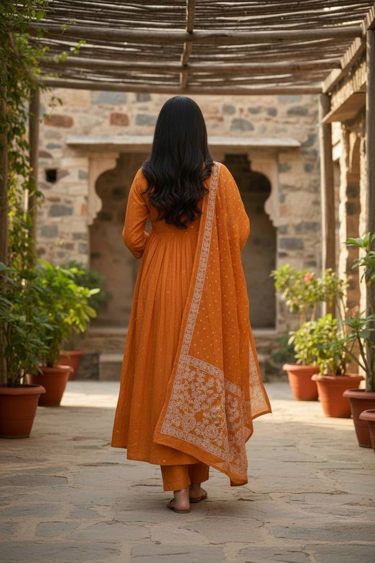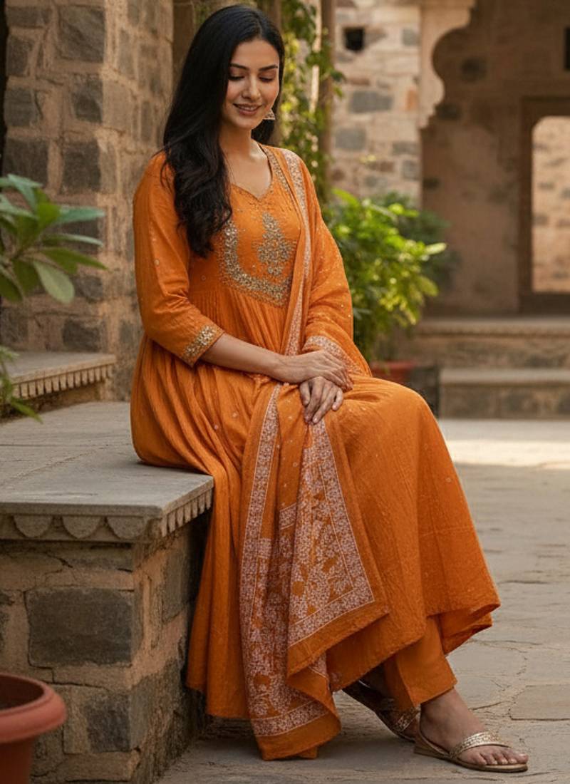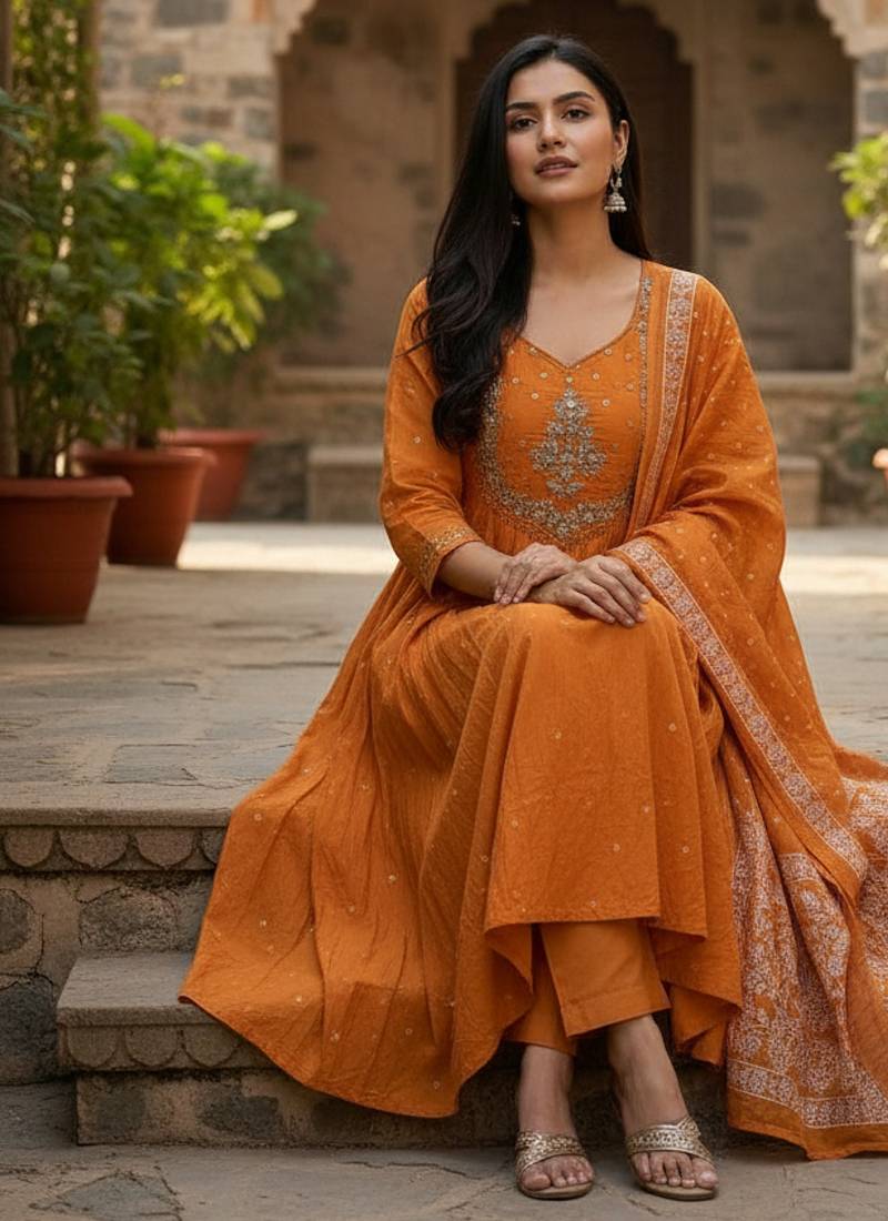 | Product Name | Orange Cotton Embroidered Flared Anarkali Pant And Dupatta Set | |