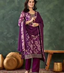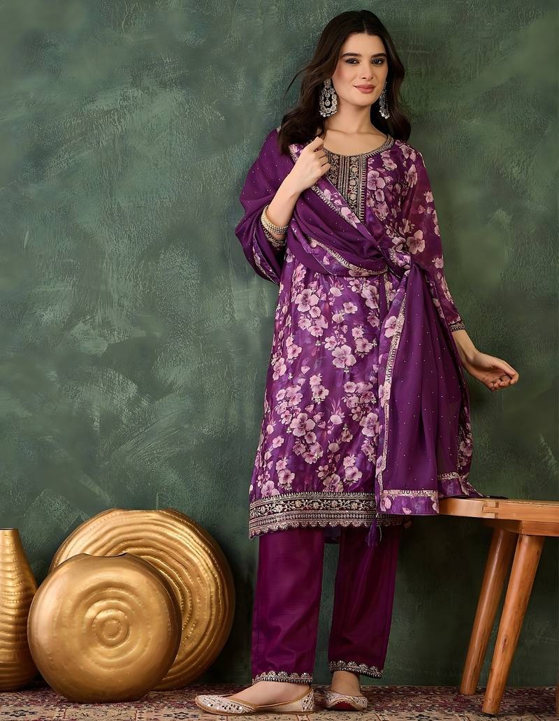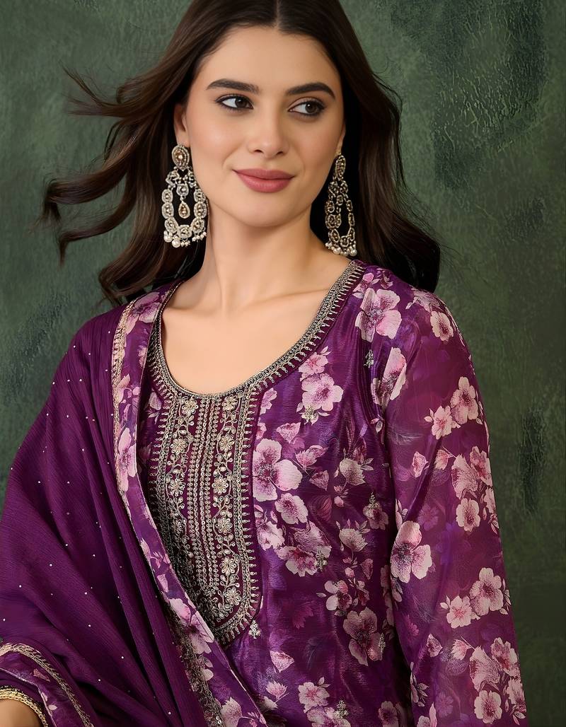 | Product Name | Purple Embroidered Chinon Silk Straight Kurta Pant And Dupatta Set | |