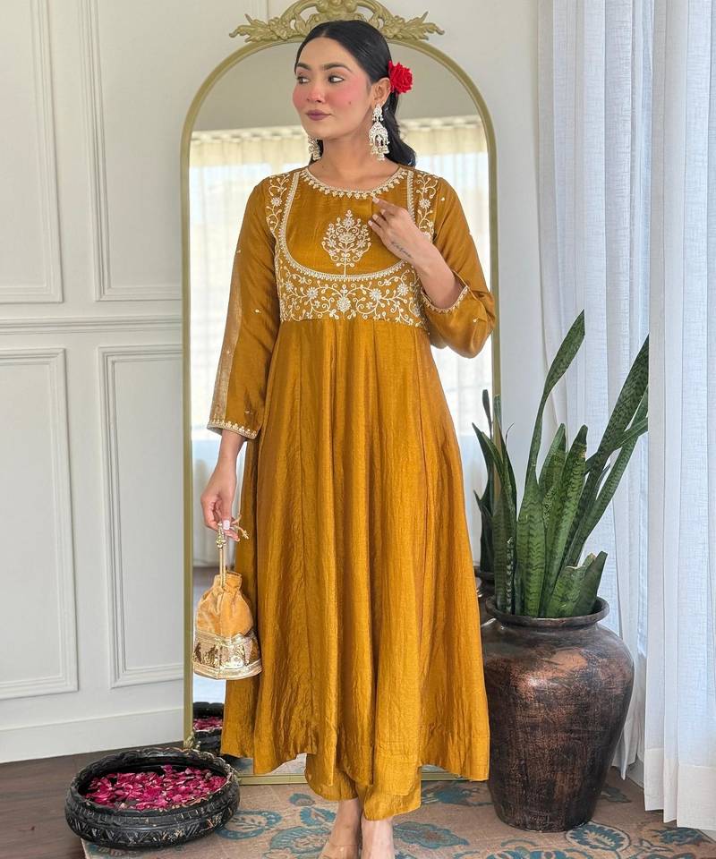 | Product Name | Yellow Vichitra Silk Embroidered Flared Anarkali Pant And Dupatta Set | |