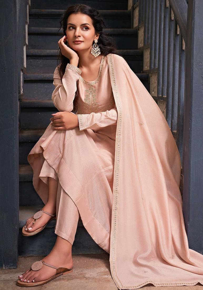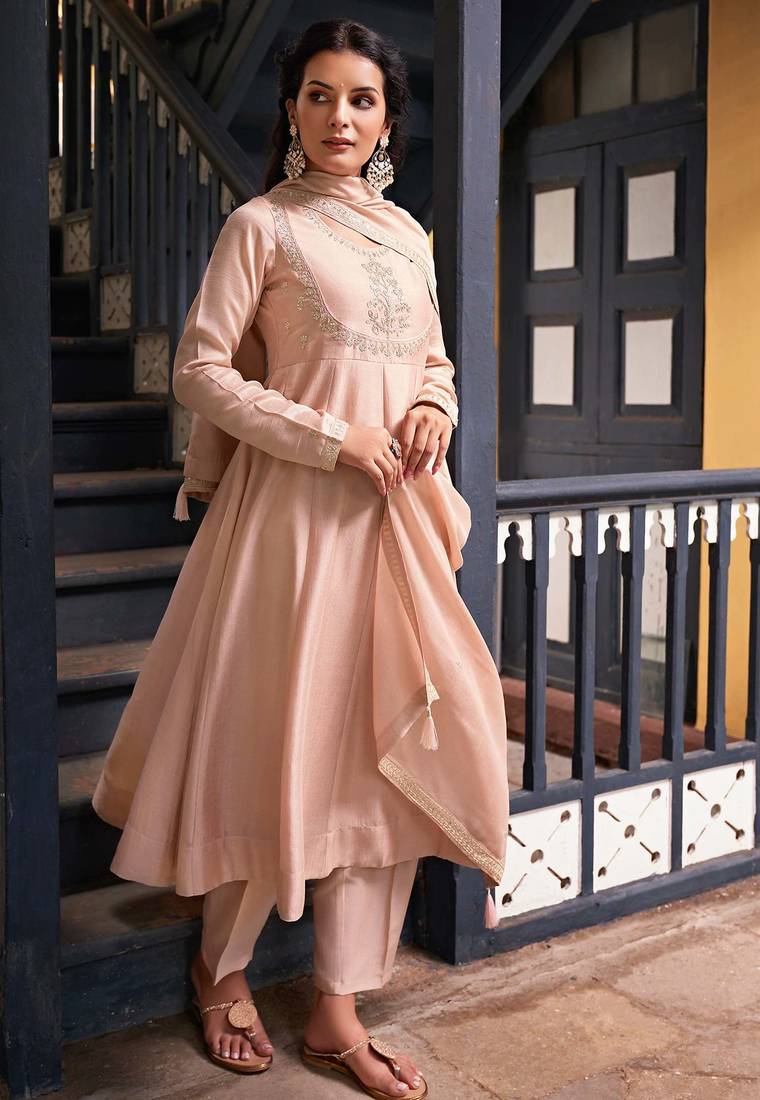 | Product Name | Peach Vichitra Silk Embroidered Flared Anarkali Pant And Dupatta Set | |