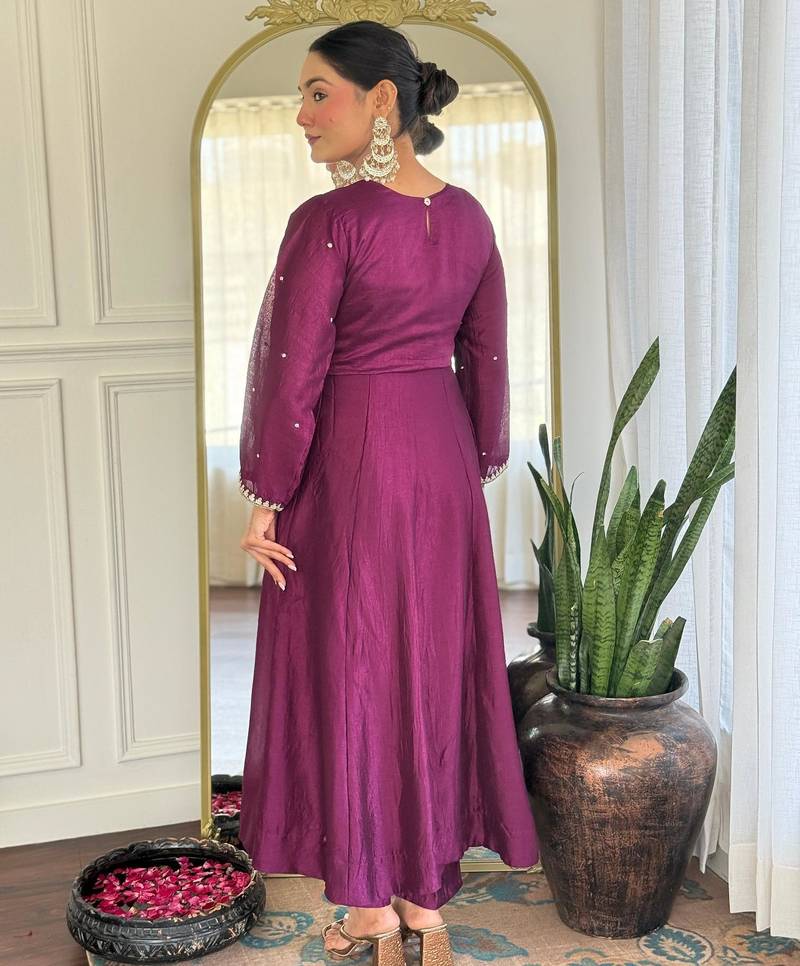 Purple vichitra silk embroidered flared anarkali pant and dupatta set