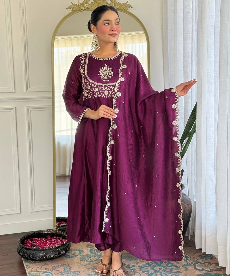 | Product Name | Purple Vichitra Silk Embroidered Flared Anarkali Pant And Dupatta Set | |