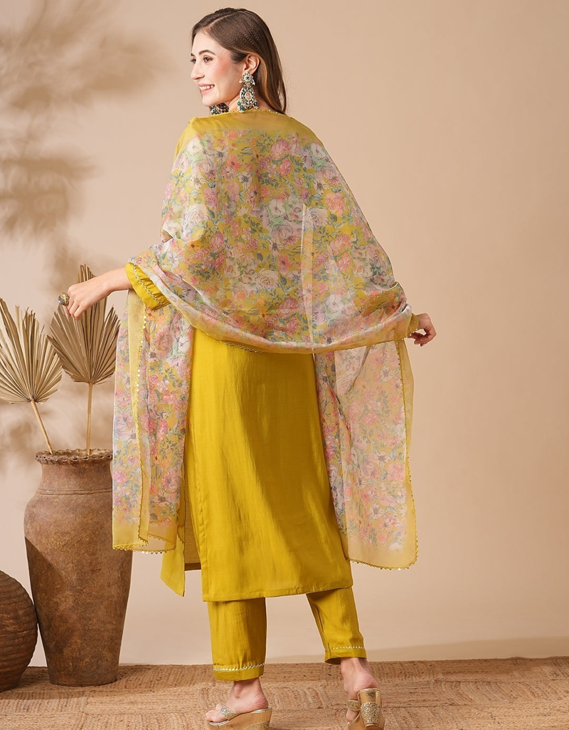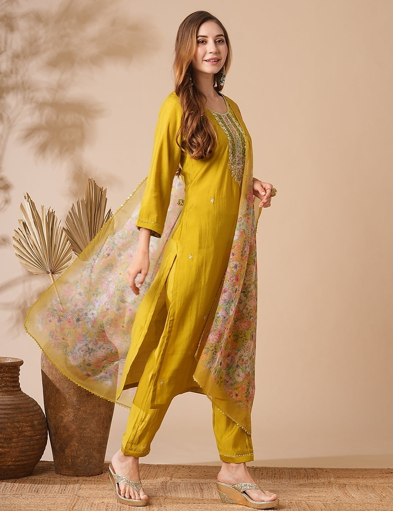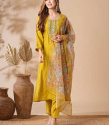 | Product Name | Yellow Viscose Chanderi Embroidered Straight Kurta Pant And Dupatta Set | |