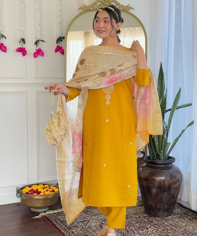 Yellow viscose embroidered straight kurta with pant and dupatta set