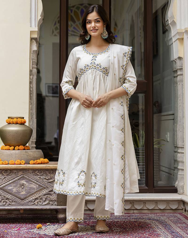 Trendmalls off-white chanderi floral embroidery salwar suit kurta pant with dupatta set stitched