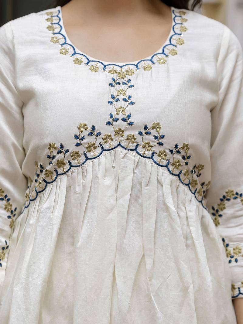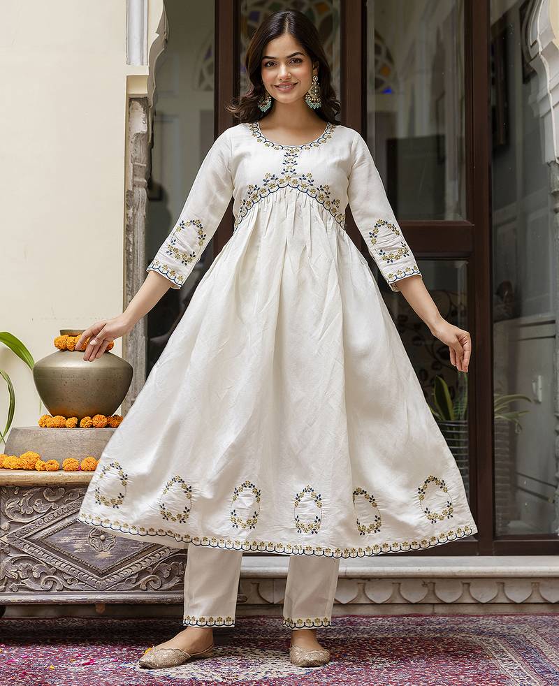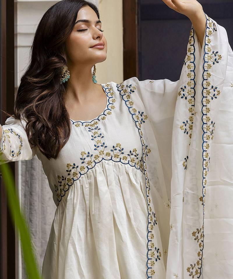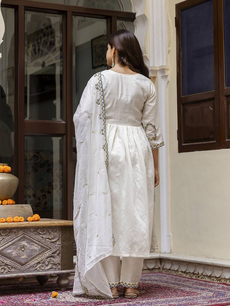 Product Description | Suit Fabric: Kurta: Chanderi Silk; Inner: Cotton; Salwar: Chanderi Silk; Dupatta: Organza Color: White || Sleeves Type: 3/4 || Neckline: Round Neck Style: A Line Alia Cut Kurta Pant Set || Work: Embroidery Cut Work Bord