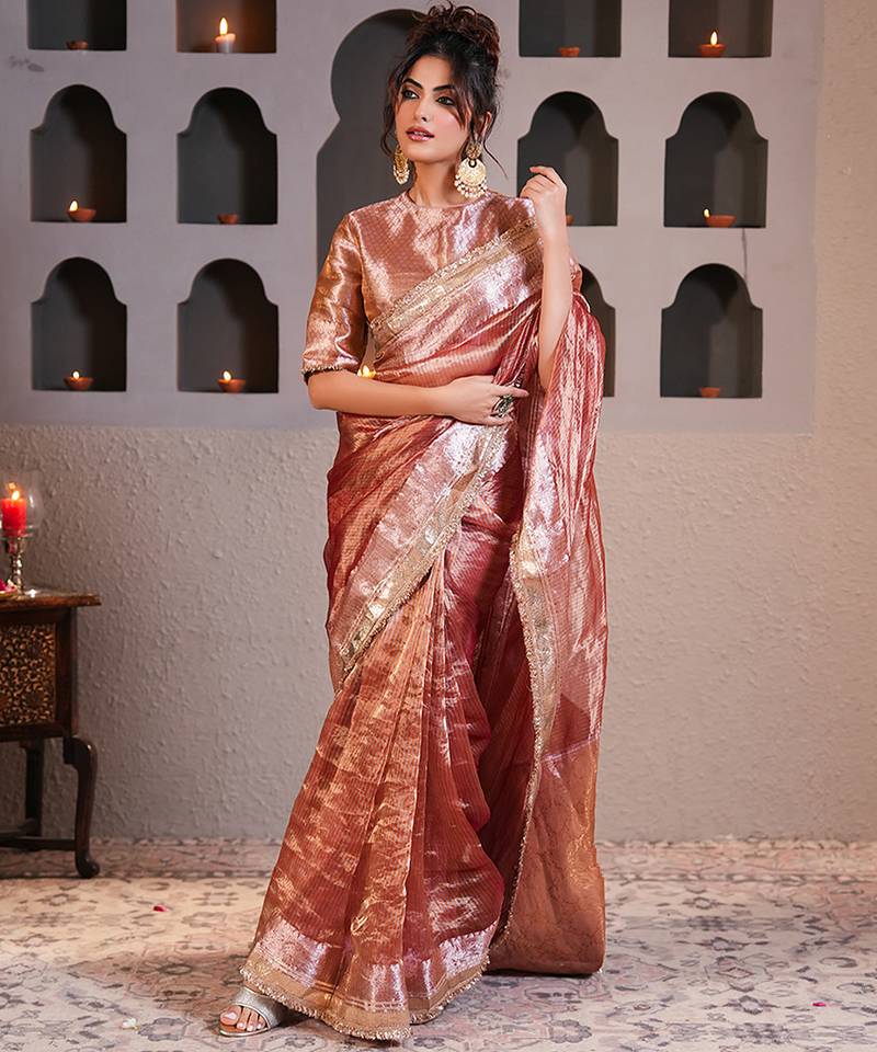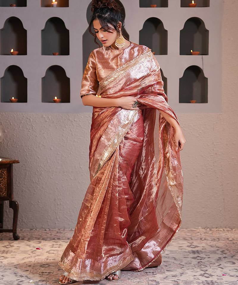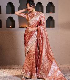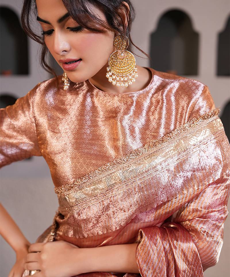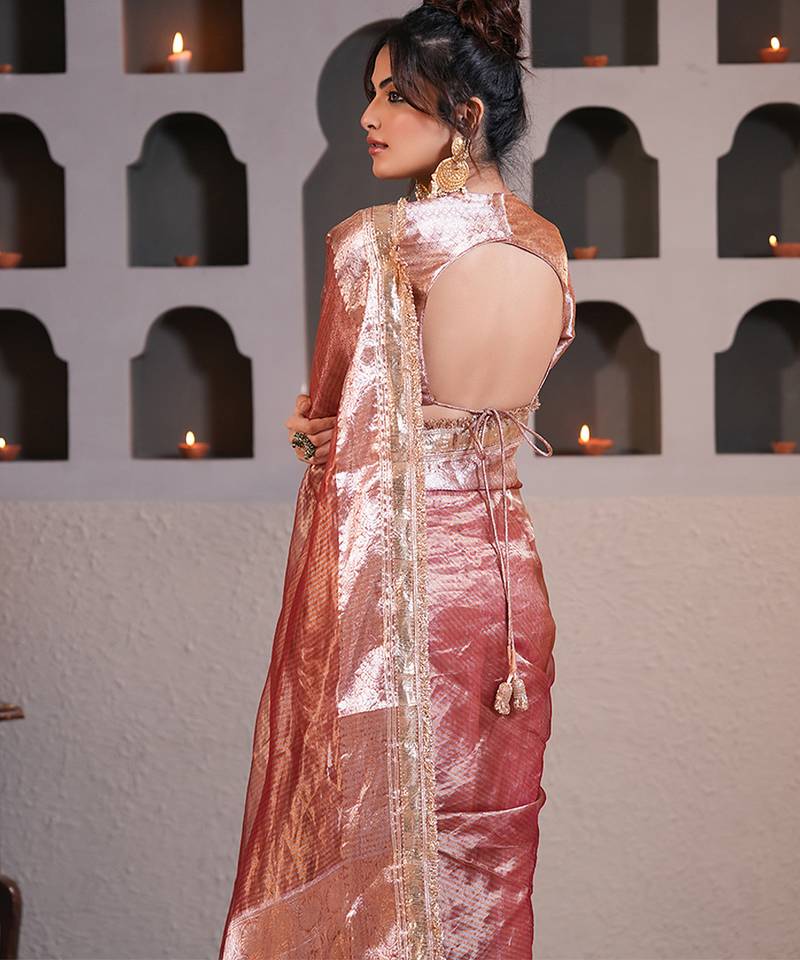 Rose gold embroidered pure tissue silk saree with blouse