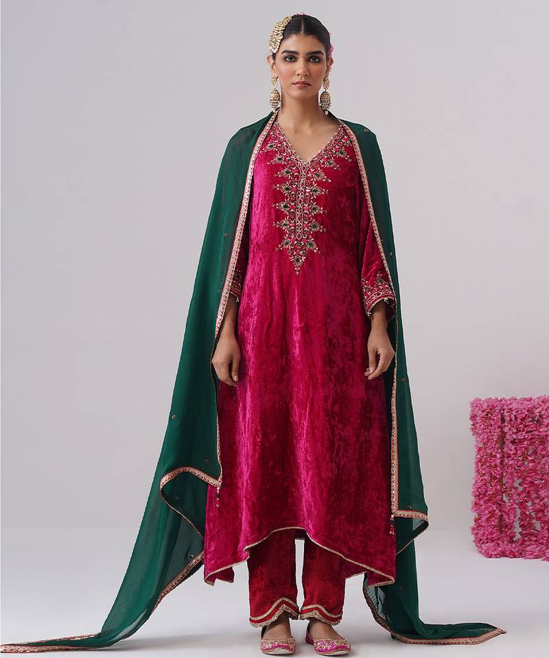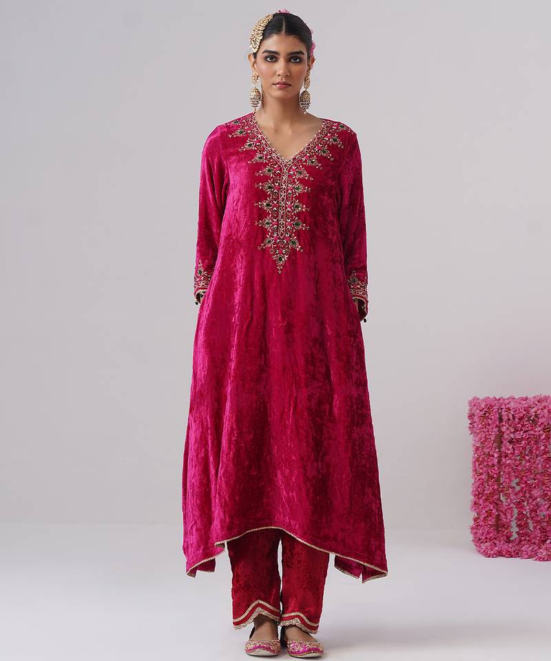Pink embroidered velvet kurta set
