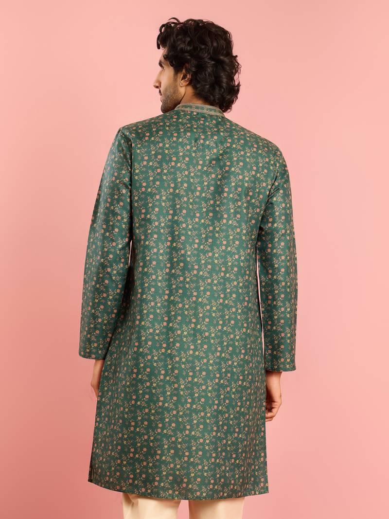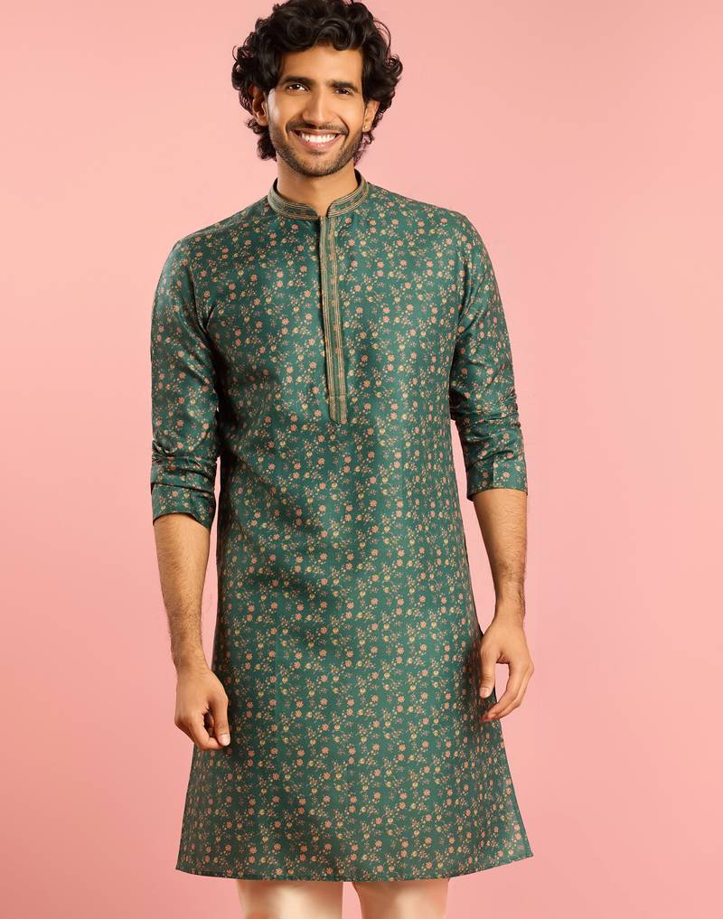 Transform Your Festive Wardrobe With This Vastramay Men's Bottle Green Cotton Blend Kurta, Crafted For Modern Ethnic Comfort. Made From Premium Cotton Blend Fabric Without Lining For Enhanced Breathability, This Kurta Features A Unique Combination Of Digital Floral Print All Over And Thread Embroidery In Geometric Pattern On Collar And Placket For Sophisticated Festive Charm. Designed With Mandarin Collar, Concealed Placket For Clean Lines, Knee Length Straight Silhouette, Full Sleeves, And Side Slits For Elegant Comfort. The Dk (Collar And Placket) Embroidery Adds Refined Detailing While The All Over Floral Print Creates Contemporary Appeal. Finished With Functional 2 Inseam Pockets, This Versatile Kurta Is Ideal For Extended Wear. Perfect For Weddings, Summer/Casual Occasions, Diwali, Festive Celebrations, Navratri, And Parties. Care Instructions: Gentle Wash Recommended.