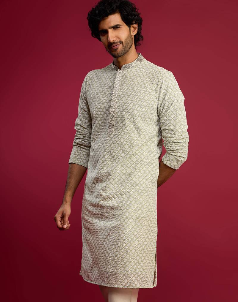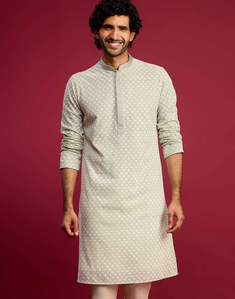 | Product Description | Celebrate In Understated Festive Luxury With This Beautifully Crafted Mint Green Kurta From Vastramay. Tailored From Premium Faux Georgette, This Long Kurta Is Adorned With All Over Geometric Thread Embroidery Inspired By The Fox Shifli Cube Embroidery Technique, With Intricate Detailing On The Collar And Concealed Placket. The Straight Silhouette, Mandarin Collar, Side Slits, And Full Sleeves Create A Polished Ethnic Profile, While Full Crepe Lining Lends Excellent Drape And Structure. Two Inseam Pockets Complete The Practical, Well Finished Design. An Ideal Choice For Weddings, Diwali, Navratri, Festive Parties, And Summer Celebrations. Care Instructions: Dry Clean Recommended. |