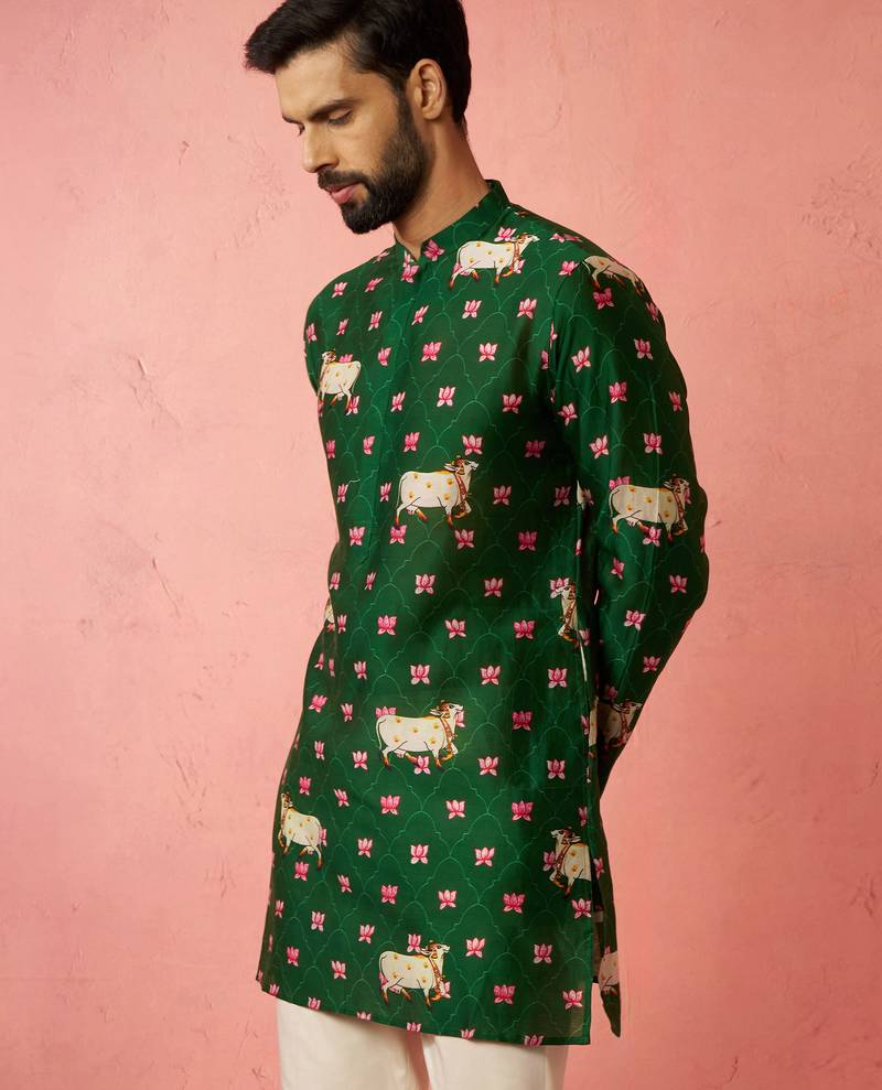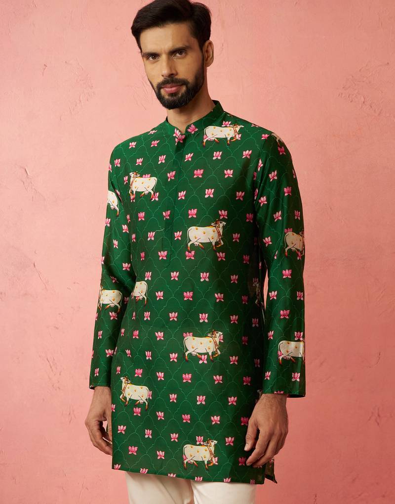 Green digital print kurta - animal floral design ethnic wear