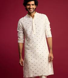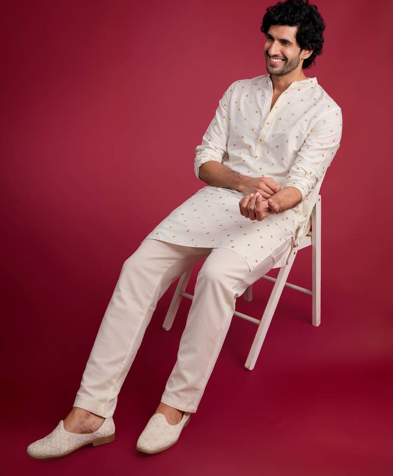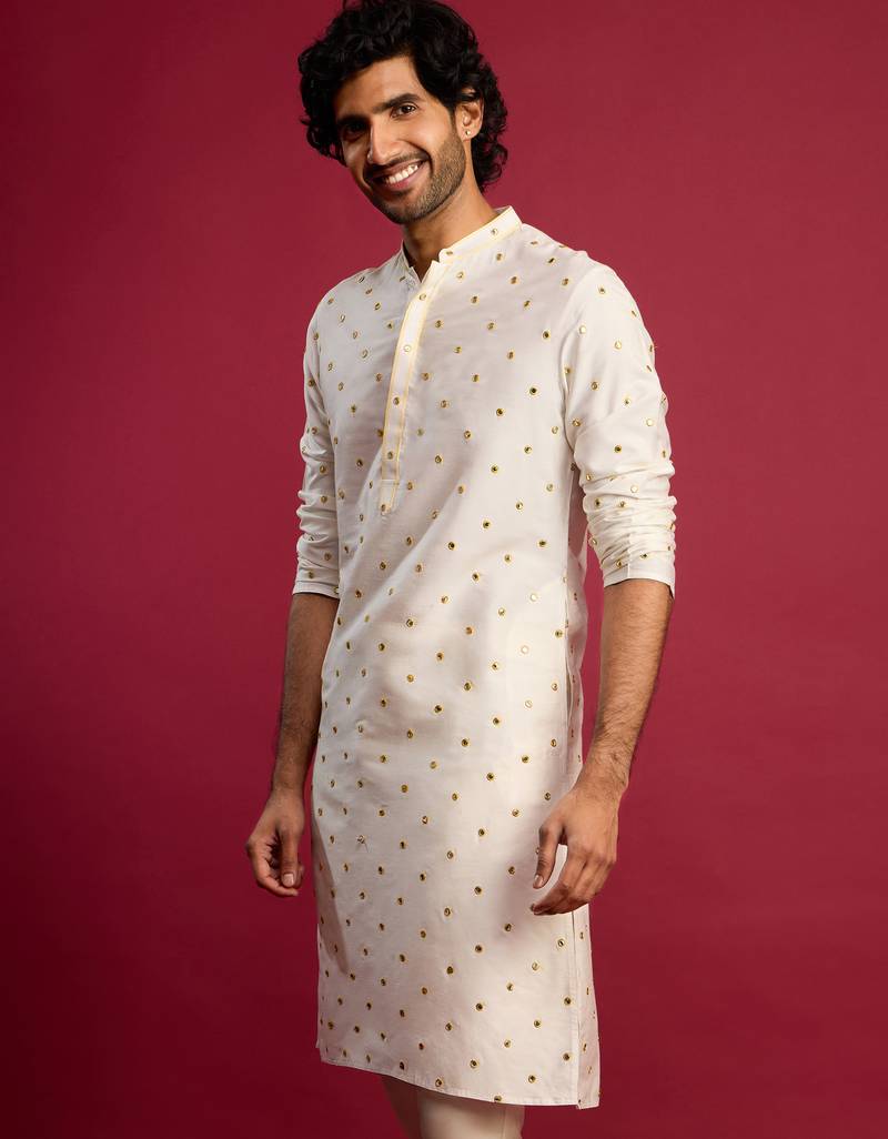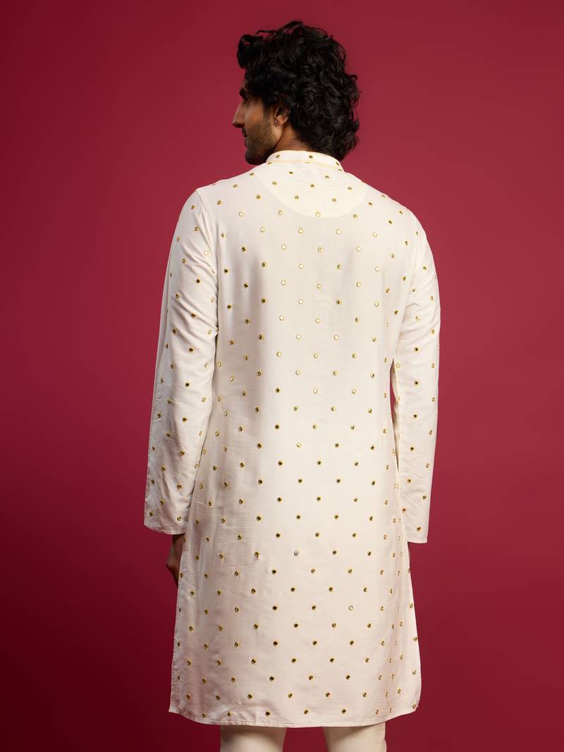 Vastramay men white viscose mirror work & thread embroidered kurta | full crepe lining | dk collar & placket