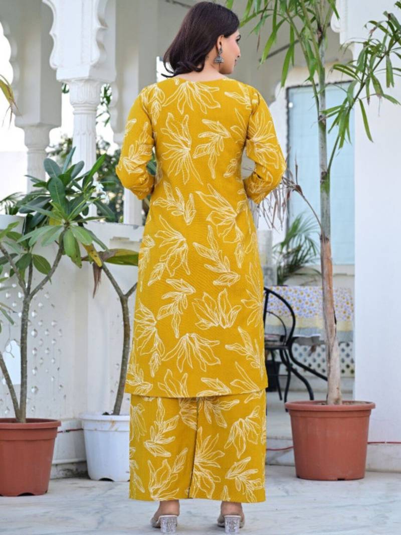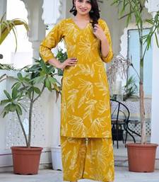Yellow floral printed regular pure cotton kurta with palazzos