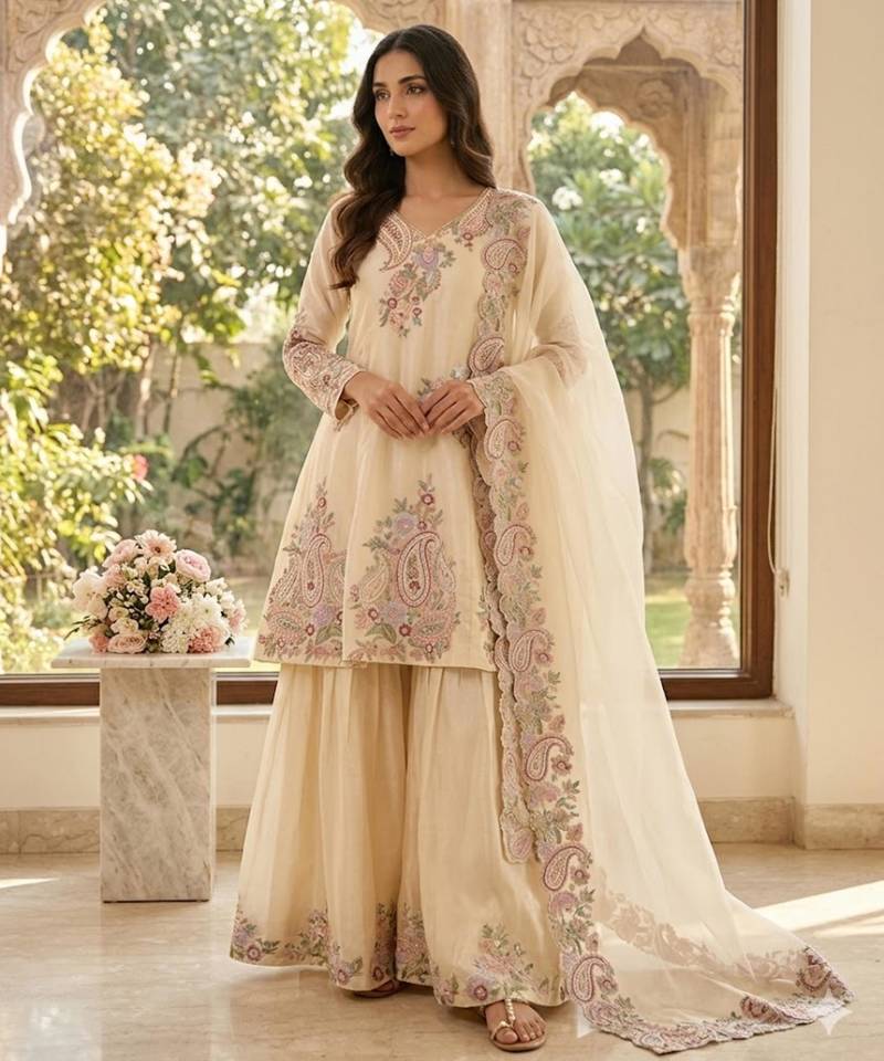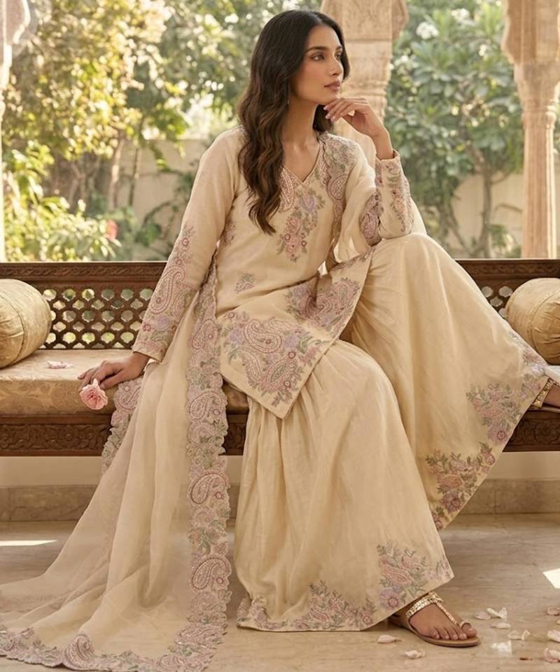 | Product Description | Elevate Your Ethnic Wardrobe With This Cream Kurta Set Featuring Intricate Paisley Embroidery And Delicate Floral Detailing. Crafted From Premium Fabric, It Offers A Soft, Luxurious Feel. Paired With Matching Pants And An Embroidered Dupatta, This Outfit Is Perfect For Festive Occasions, Celebrations, And Elegant Day Events. |