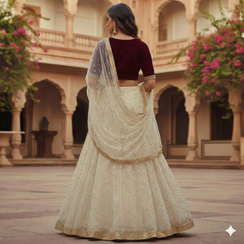 | Product Description | This Ivory Lehenga Features A Heavily Flared Skirt With Subtle Shimmer, Paired With A Maroon Velvet Blouse And Sheer Dupatta. Gold Detailing Enhances Its Luxurious Appeal. Ideal For Weddings And Receptions, It Offers Timeless Elegance With A Rich, Festive Finish. |