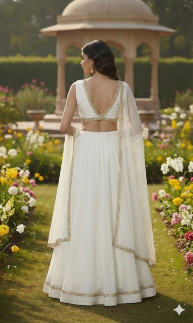 | Product Description | This Ivory White Lehenga Set Features A Sleeveless Blouse, Flowing Skirt, And Sheer Dupatta With Refined Gold Trim. The Lightweight Fabric Ensures Easy Movement And Comfort. Perfect For Engagement Ceremonies, Daytime Weddings, And Elegant Festive Celebrations With A Soft, Luxurious Feel. |