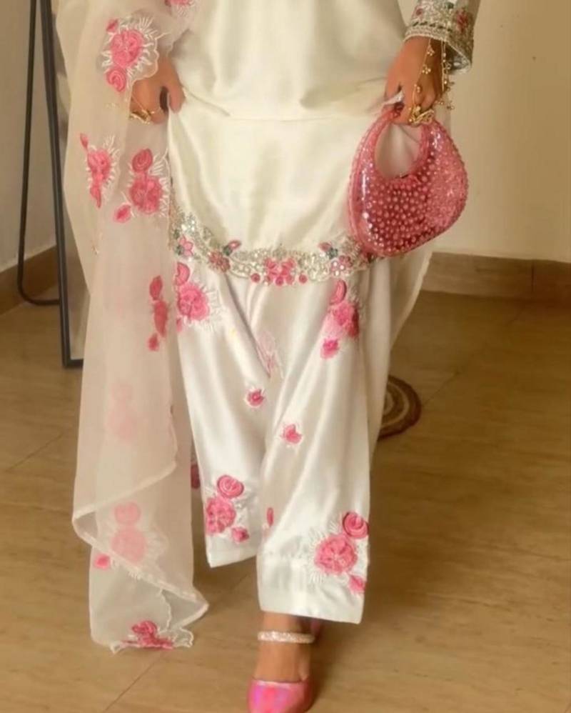 | Product Description | This Exquisite Pearl White Satin Ensemble Showcases A Unique Blend Of Textures And Colors. The High Sheen Kurta Features A Distinctive Silver Sequined Keyhole Neckline, While The Trousers And Sheer Dupatta Are Adorned With Delicate Pink Floral Appliqués. It Is A Refined, Avant Garde Choice For The Modern Woman Seeking Understated Luxury And Craftsmanship. |