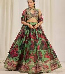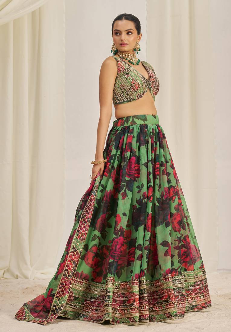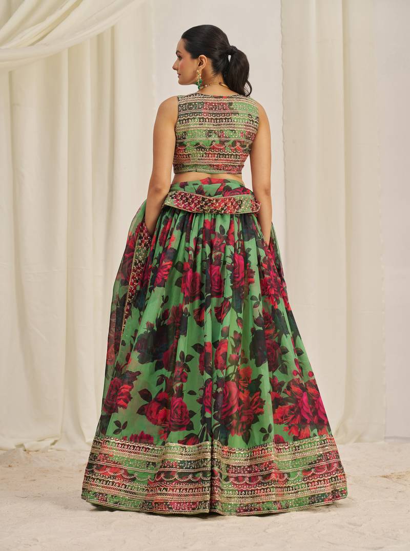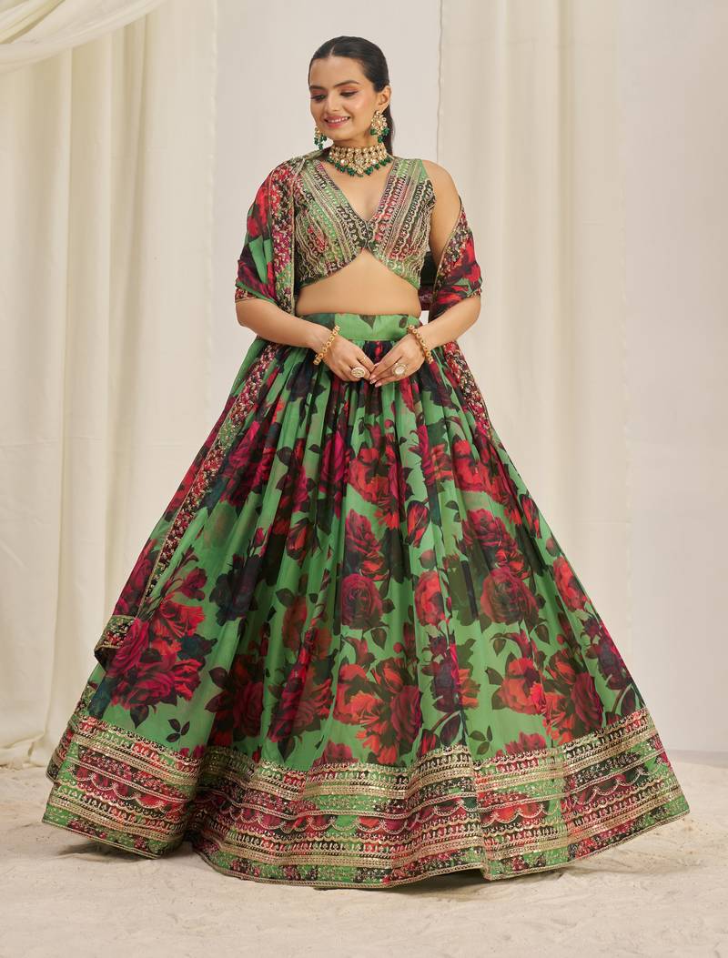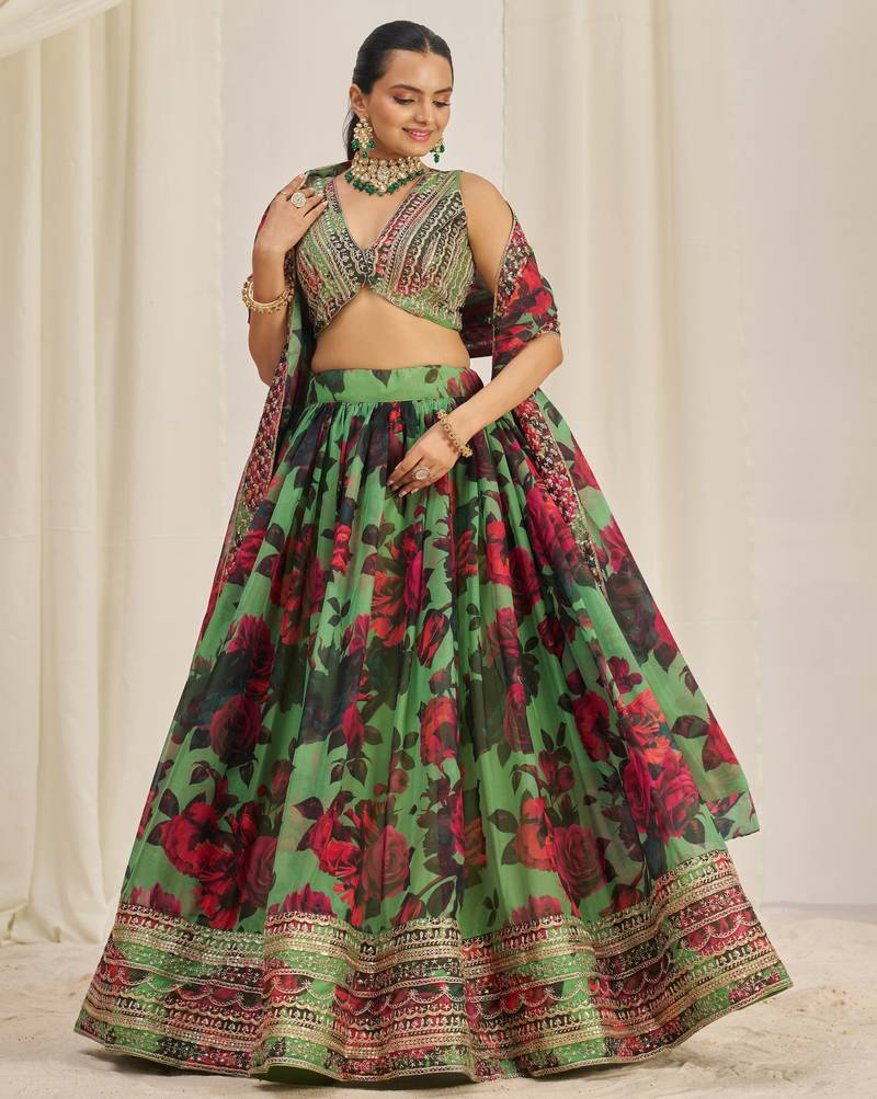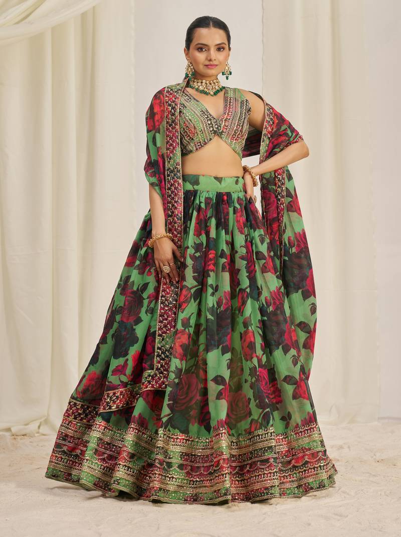 Parrot green zari sequins embroiderey floral printed organza lehenga choli