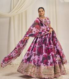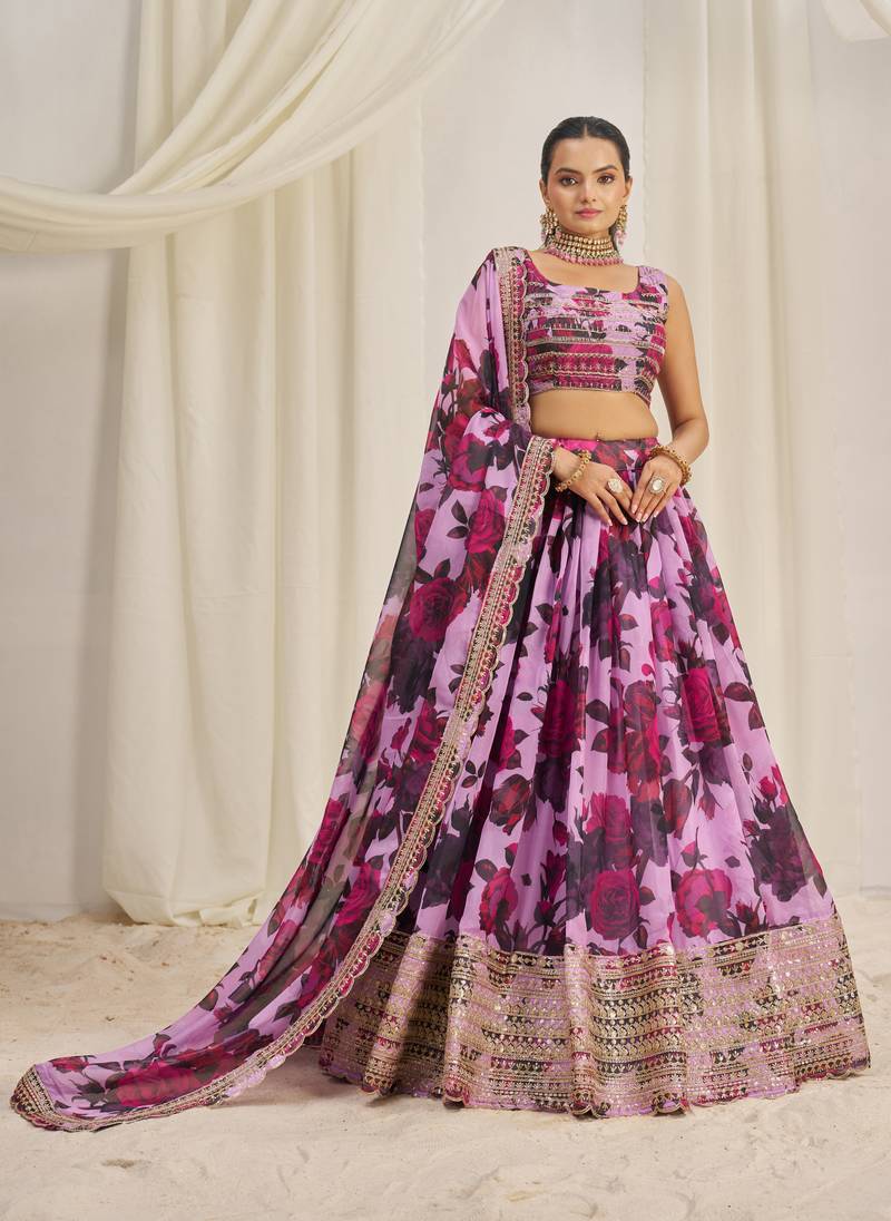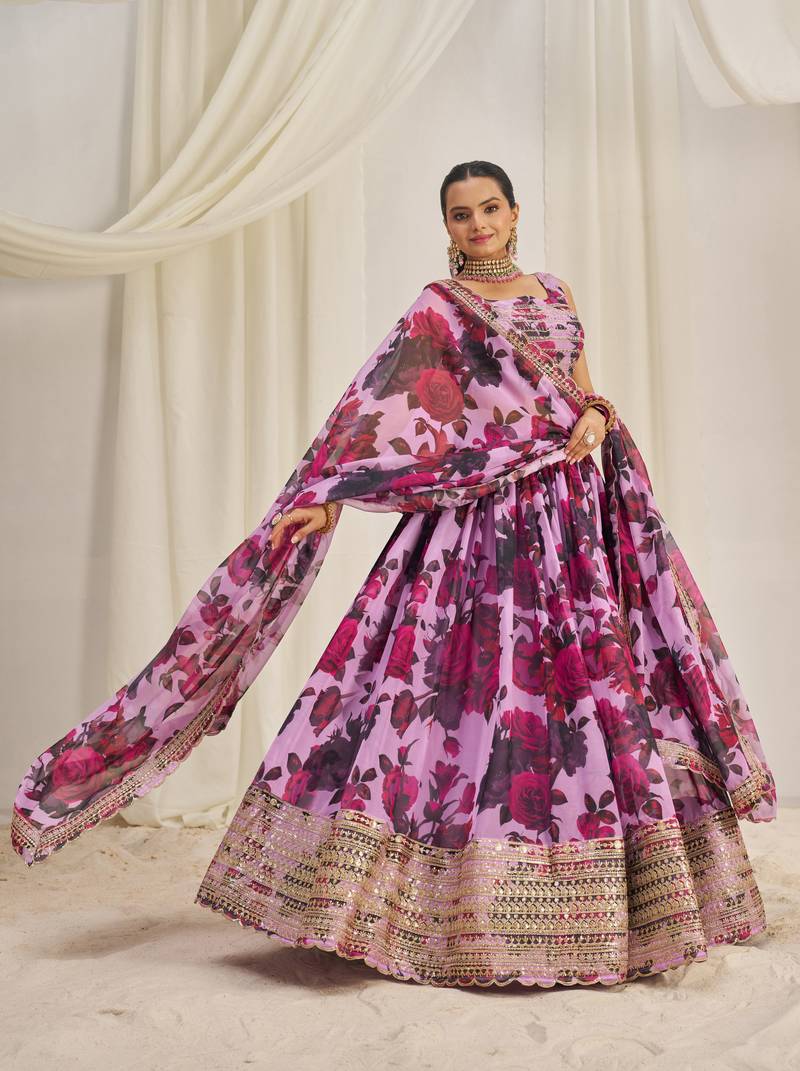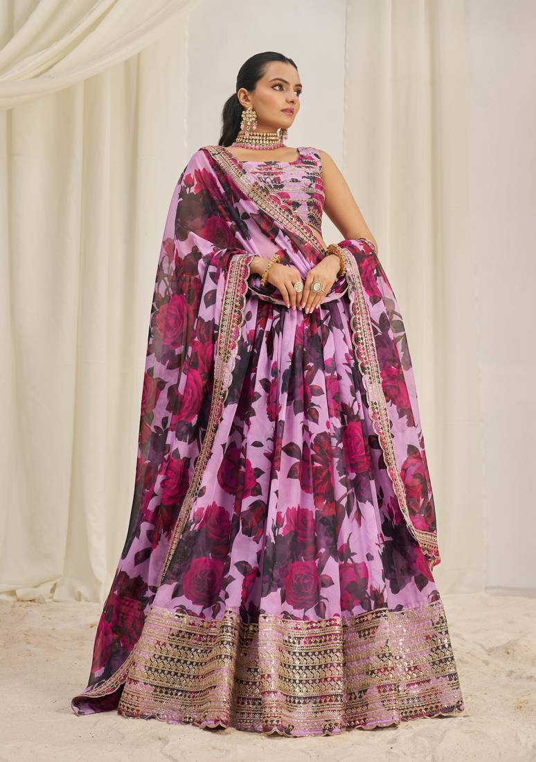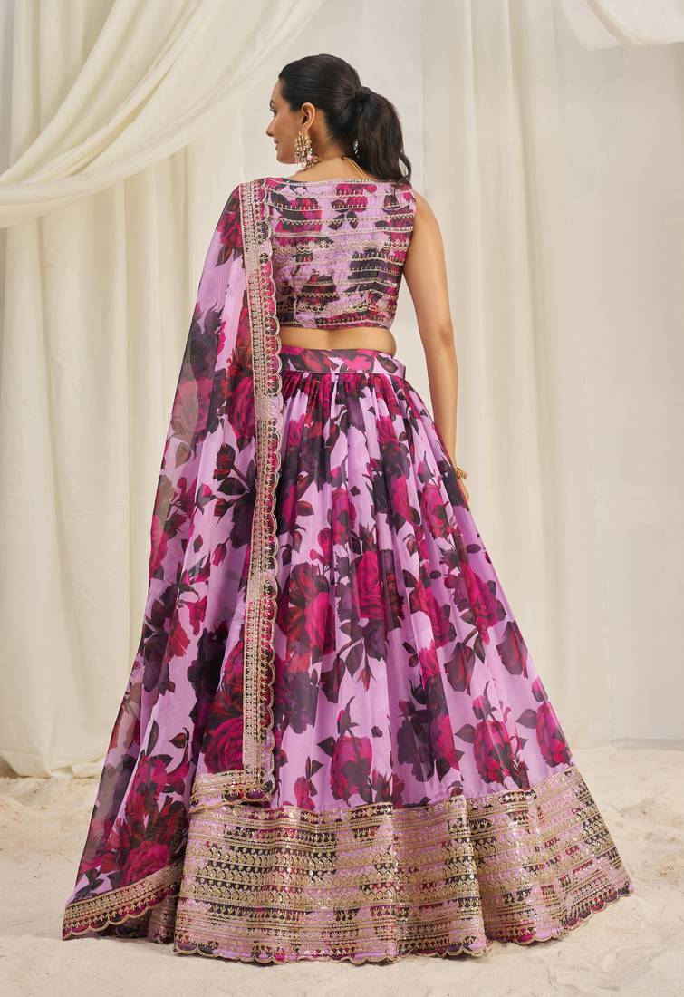 Baby pink zari sequins embroiderey floral printed organza lehenga choli