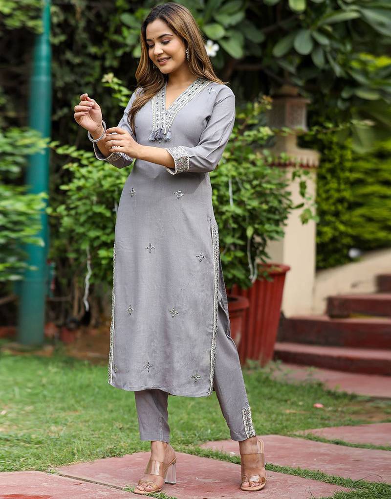 | Product Name | Floral Embroidered V Neck Sequinned Straight Kurta With Trousers & Dupatta | |