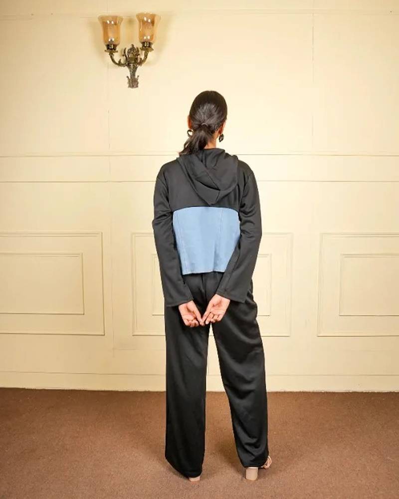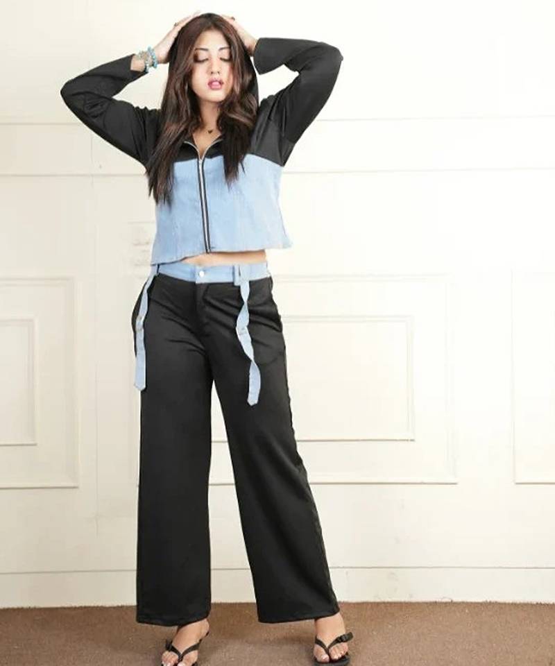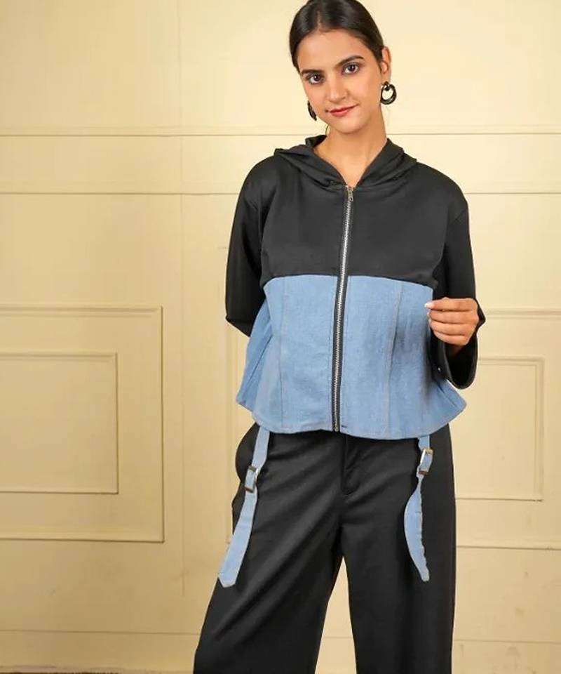 | Product Name | Black Denim Blue Stretchable Fabric Zipper Free Size Co Ord Set | |