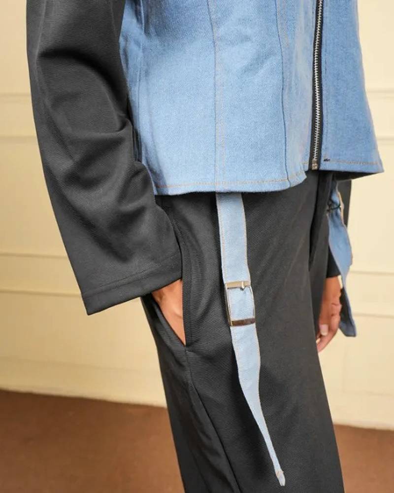 Black denim blue stretchable fabric zipper free size co ord set