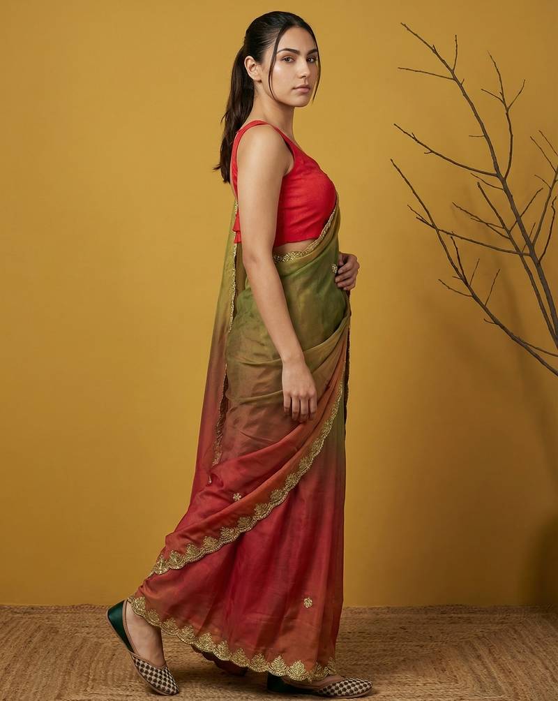 Multicolor ombre zari embroidery border work organza silk
