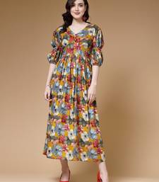 | Product Description | Indibelle Mustard Floral Print Rayon Dress, Has A V Neck With Puffed Sleeve And 3 Mould Button At Yolk, Gathered At Waist , Ankle Length With Side Slit Flared Maxi |