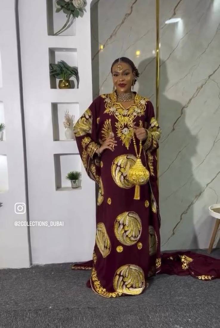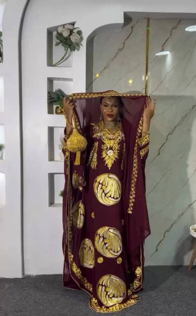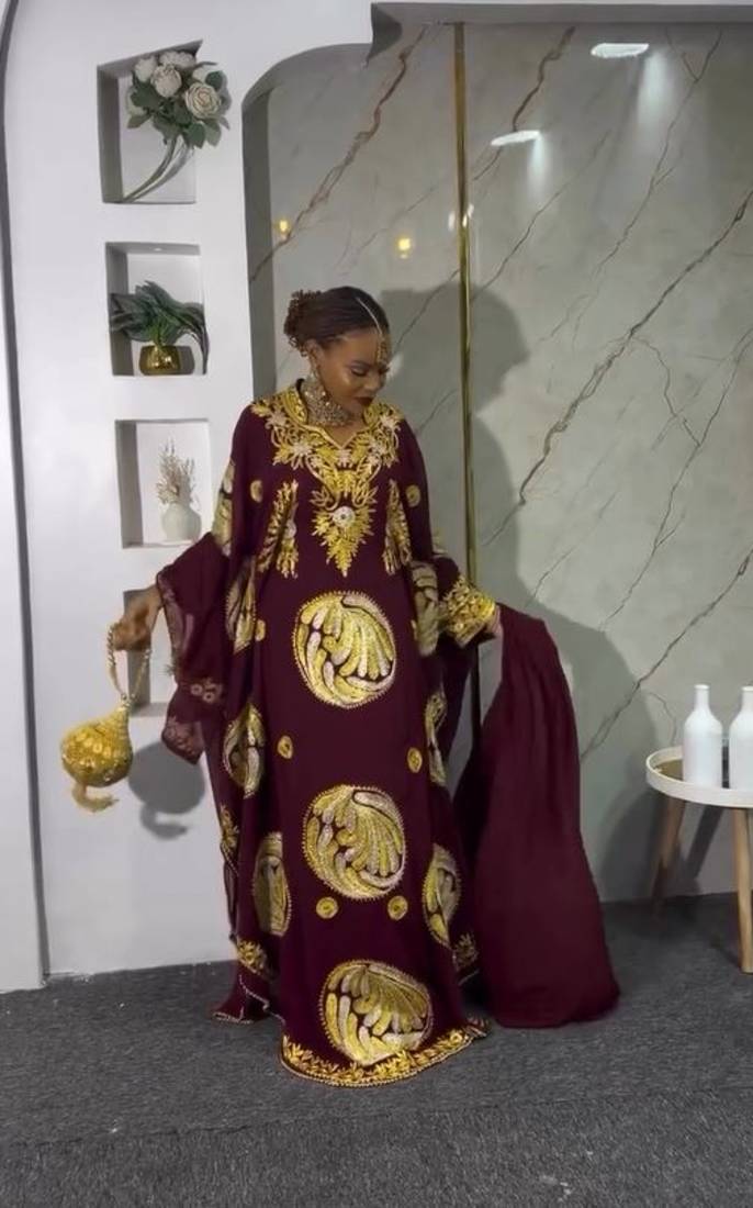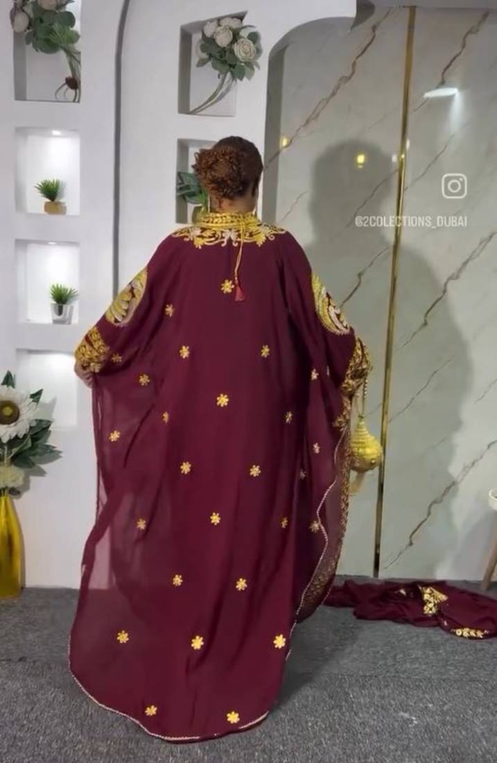 | Product Description | New Wine Aari Embroidered Abaya With Gold Detailed Work For Women's |