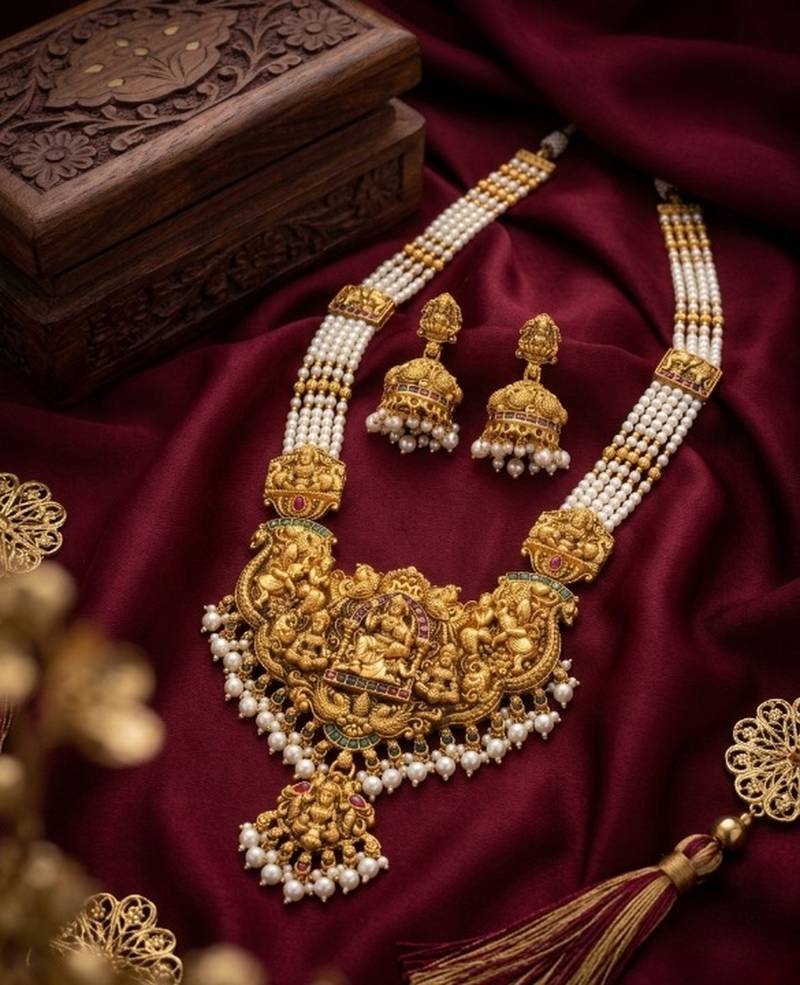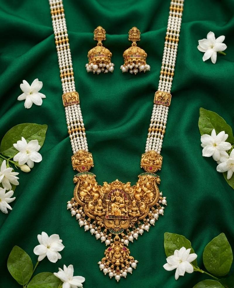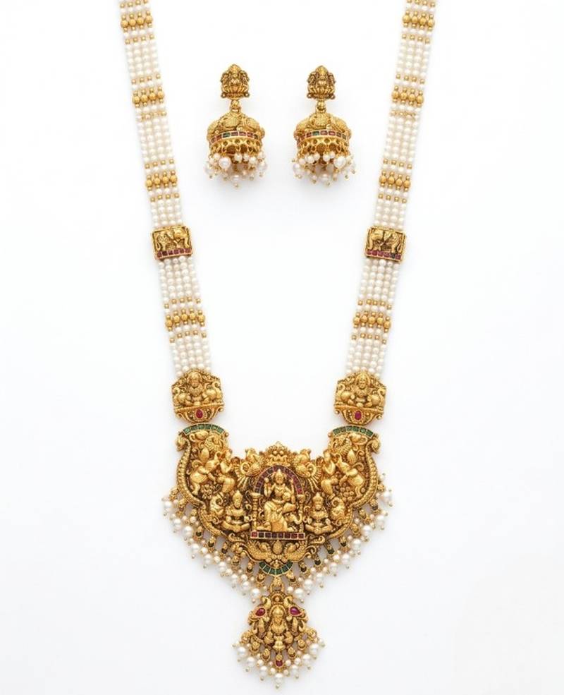 | Product Name | Antique Gold Plated Lakshmi Temple Necklace / Set With Green Beads And Jhumkas | |