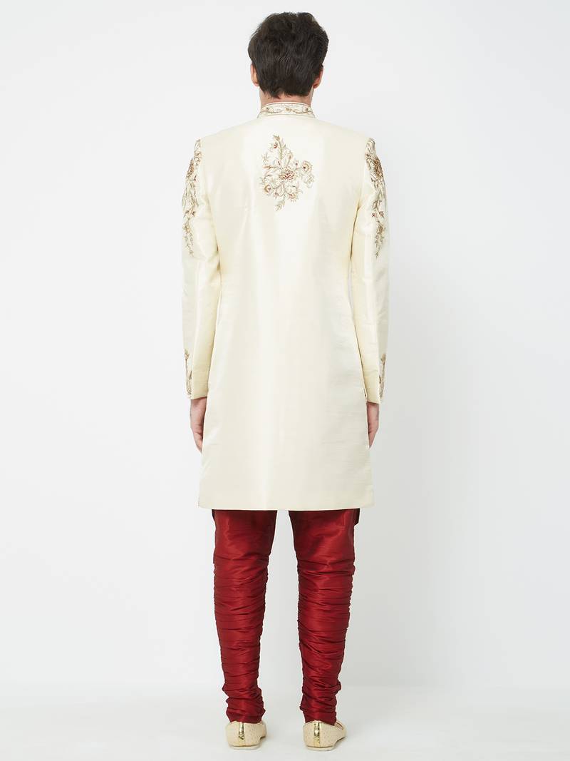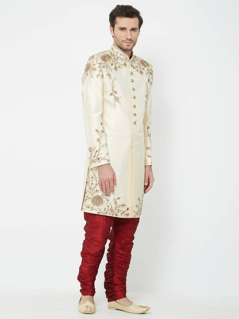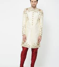 Fawn art silk straight embroidery with handwork sherwani for men's