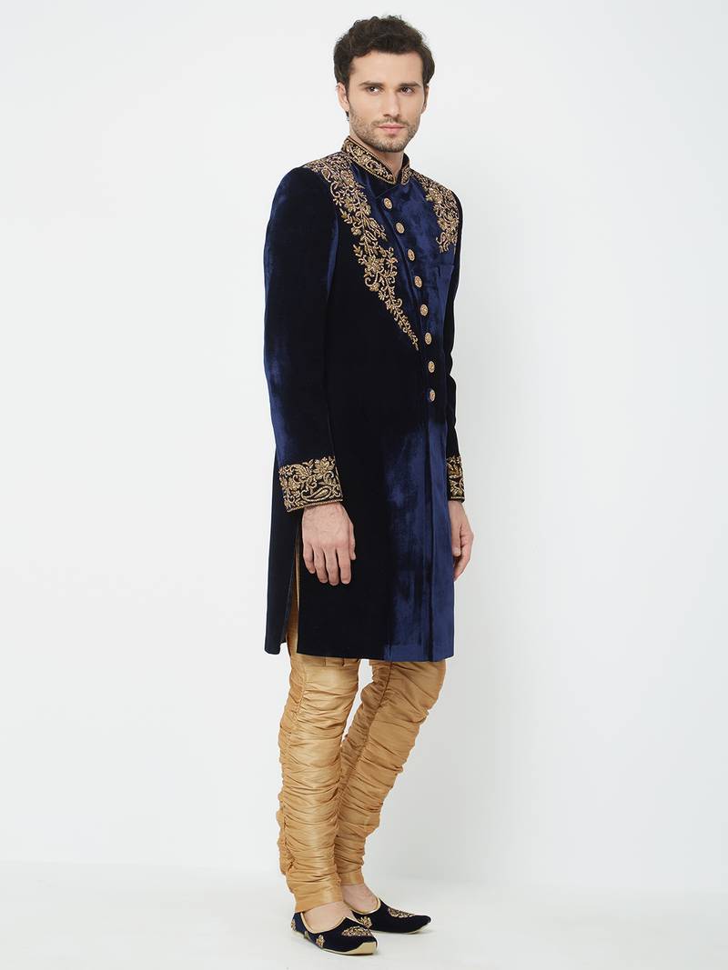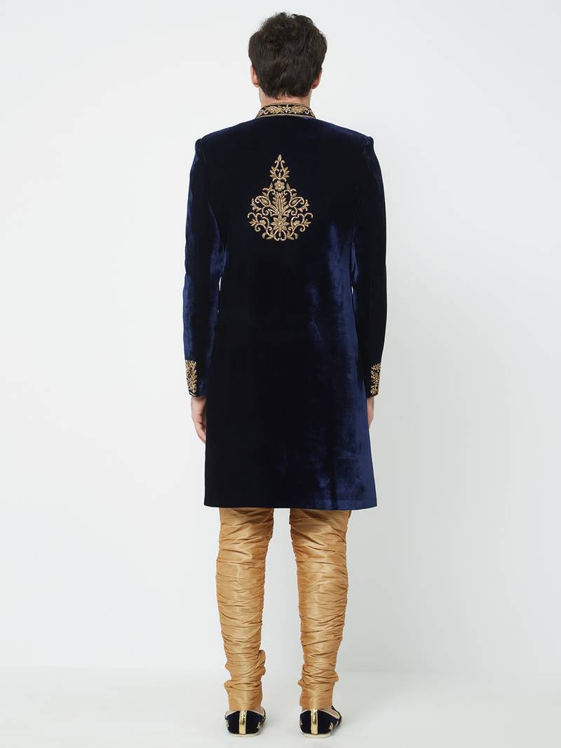 Navy blue velvet straight embroidery with handwork sherwani for men's