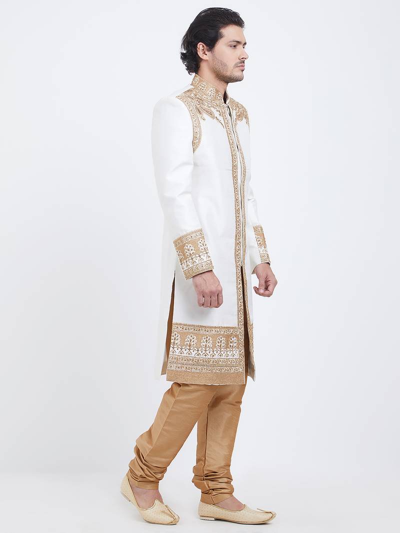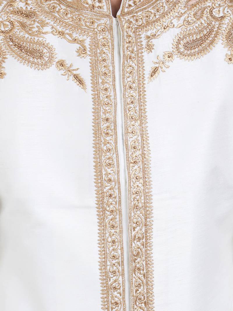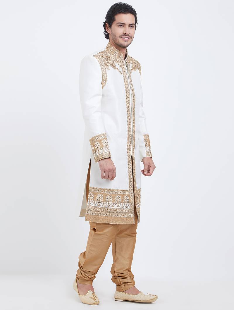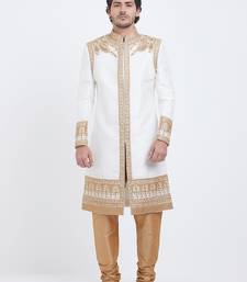 Off white art silk straight embroidery with handwork sherwani for men's