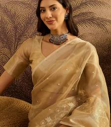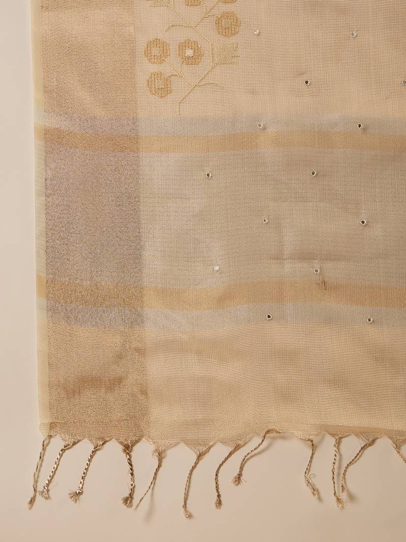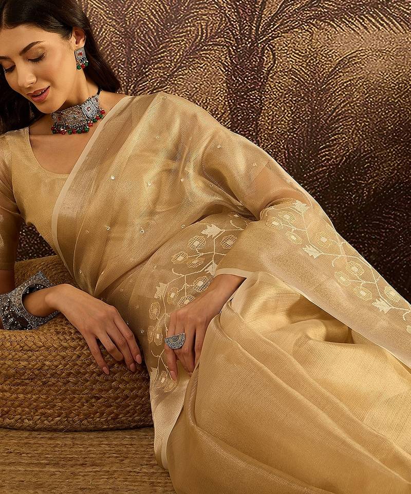 Beige super net embroidered saree with unstitched blouse piece