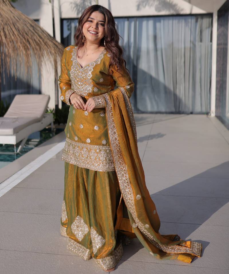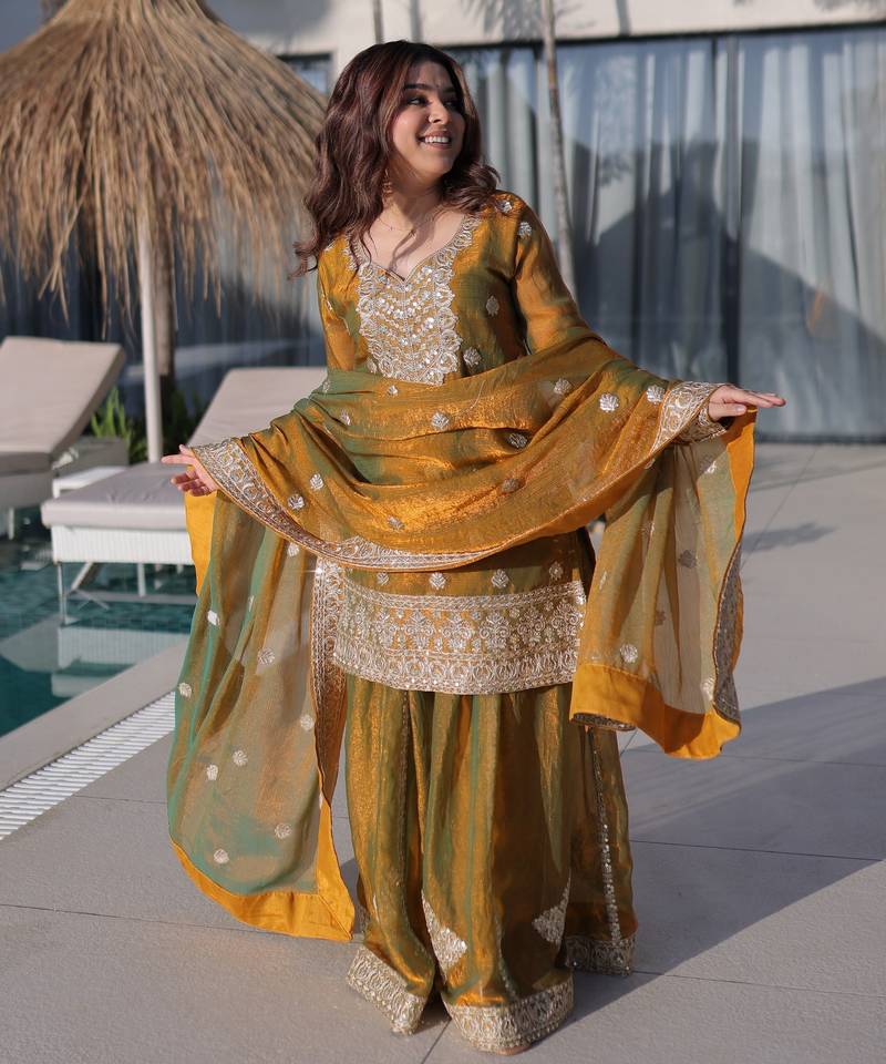 | Product Name | Gold Color Fendy Chiffon Fabric Jari And Sequance Embroidery Work Heavy Ceremonial Attire | |