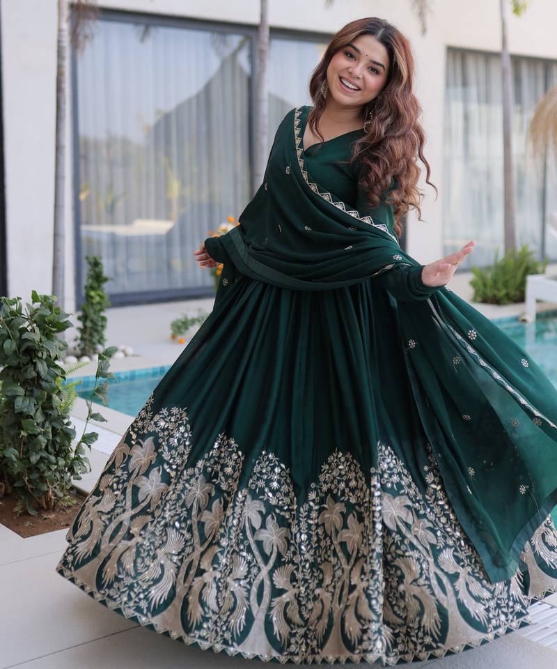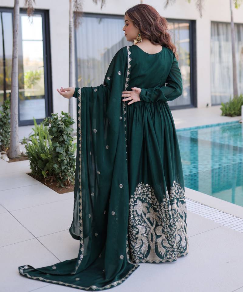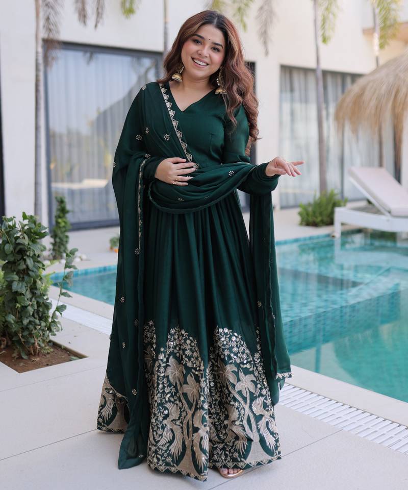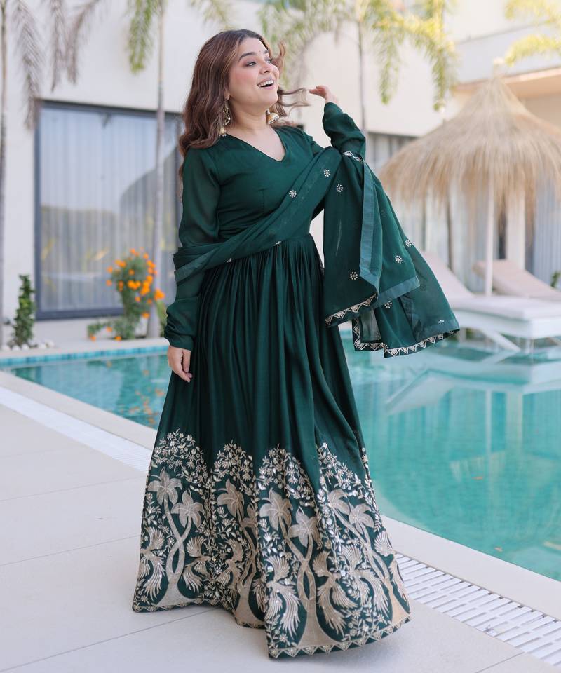 Green color rangoli crush fabric designer embroidered heavy partywear gown