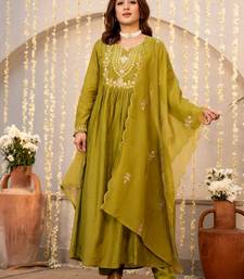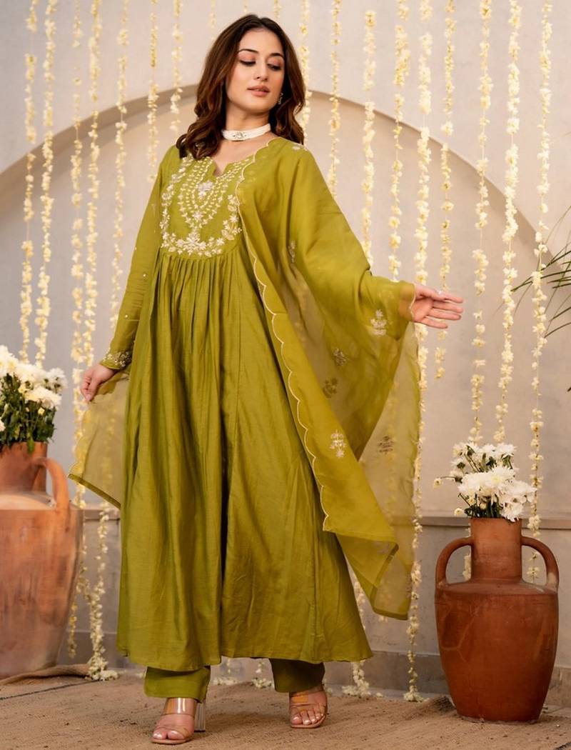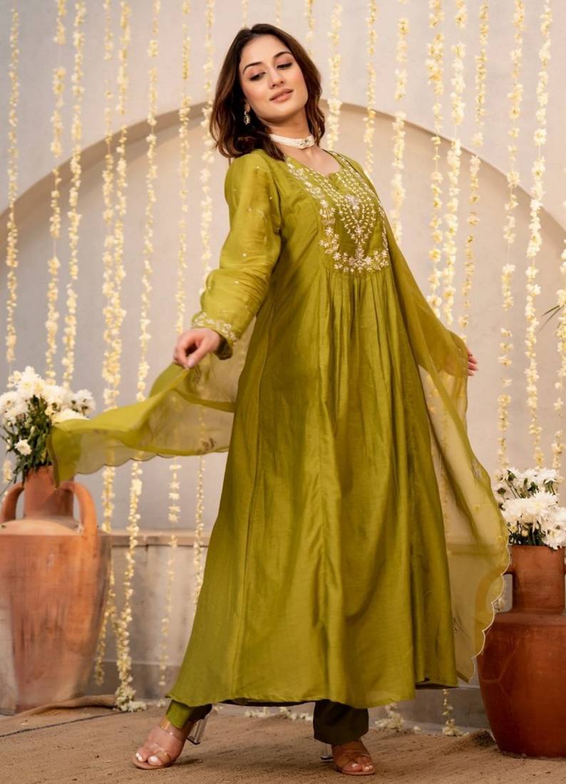 | Product Name | Mahendi Color Chanderi Fabric Designer Stylish Fancy Kurta Set For Girls | |