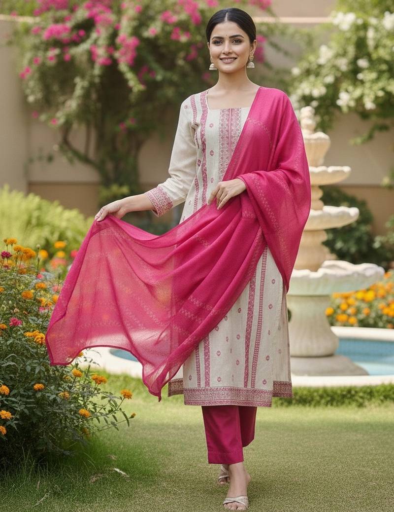 Off white color jaquard silk fabric designer ceremonial ethnic readymade suit