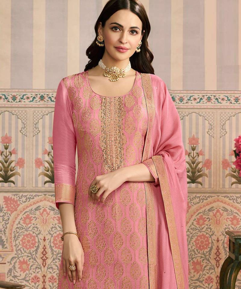 | Product Name | Peach Viscose Jacquard Woven Partywear Readymade Suit | |