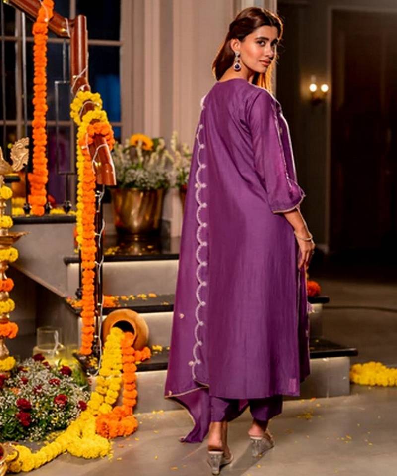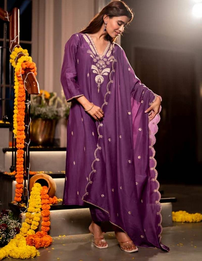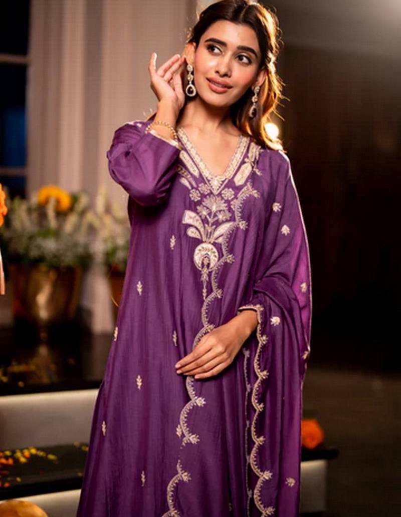| Product Name | Purple Color Mal Chanderi Fabric Designer Stylish Fancy Kurta Set For Girls | |