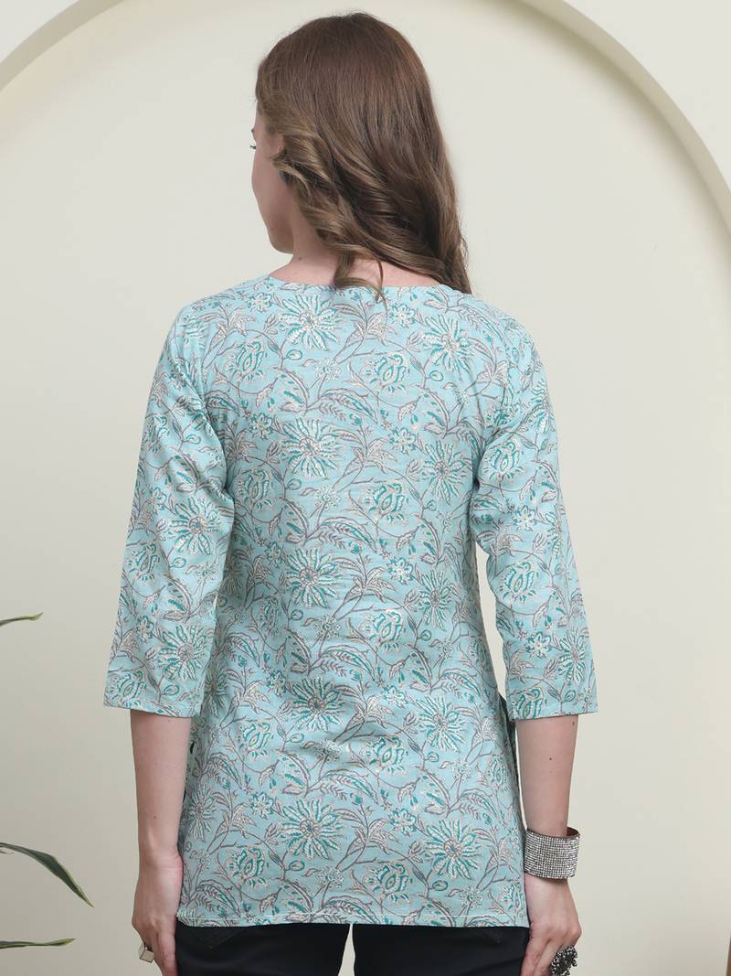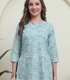 Teal cambric cotton printed formal short kurta