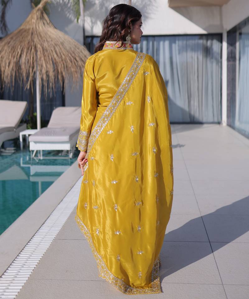 Yellow color silk fabric jari and sequance embroidery work heavy ceremonial attire