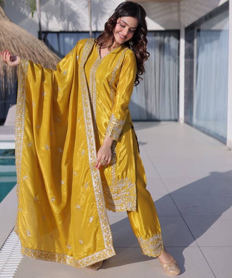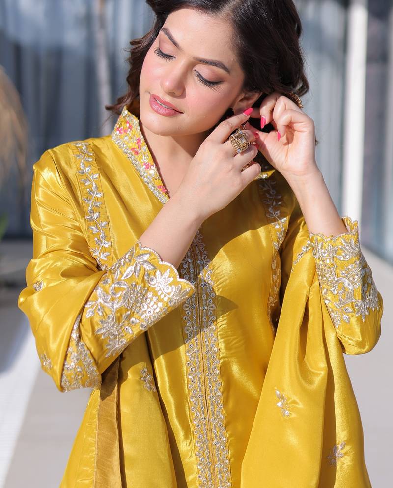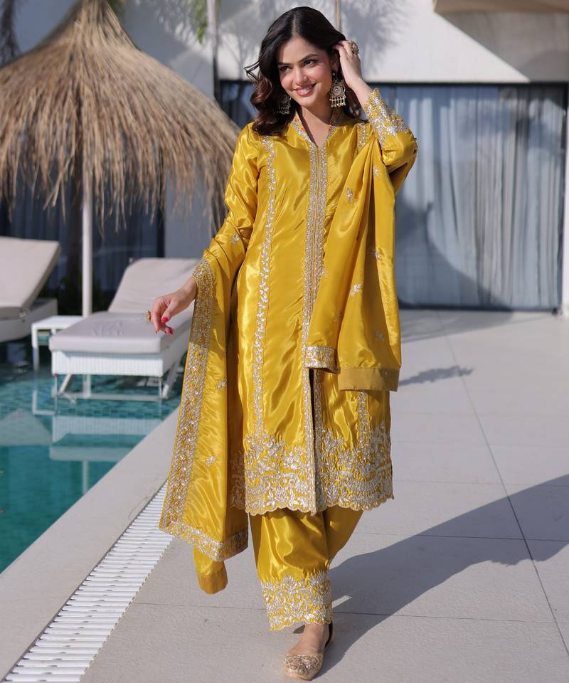 | Product Name | Yellow Color Silk Fabric Jari And Sequance Embroidery Work Heavy Ceremonial Attire | |