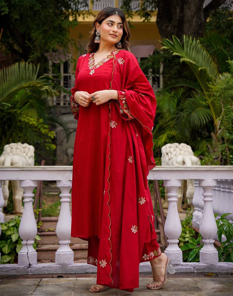 Make A Grand Entrance With Our Women's Chanderi Silk Sequin Embroidery V Neck Red Kurta Pant Set, A Masterpiece Designed For Those Who Love High End Designer Kurta Sets. This Vibrant Readymade Suit Combines The Regal Texture Of Chanderi Silk With A Striking Scarlet Hue, Offering A Bold Alternative To A Standard Anarkali Suit Or Pakistani Suit. The Kurta Features A Flattering V Neckline Adorned With Meticulous Sequin Work, Perfect For Those Searching For Heavy Work Kurtis That Exude Luxury And Confidence.