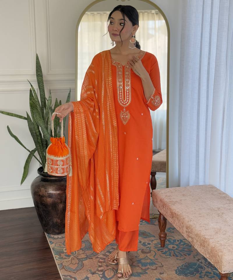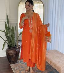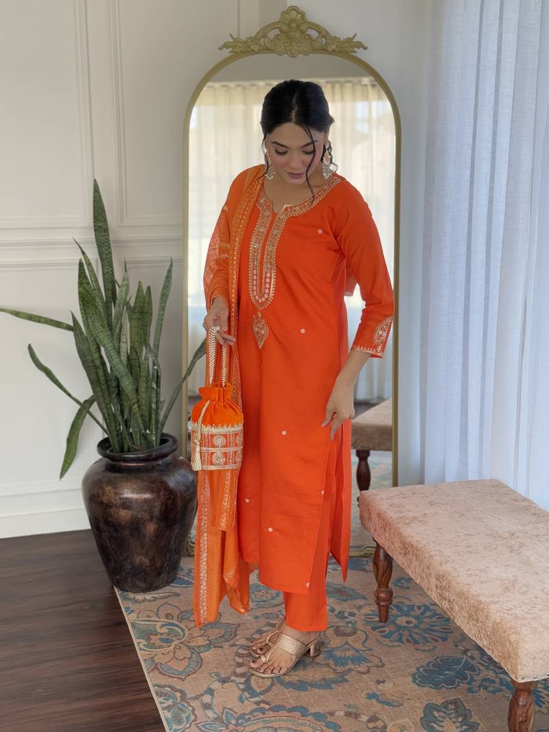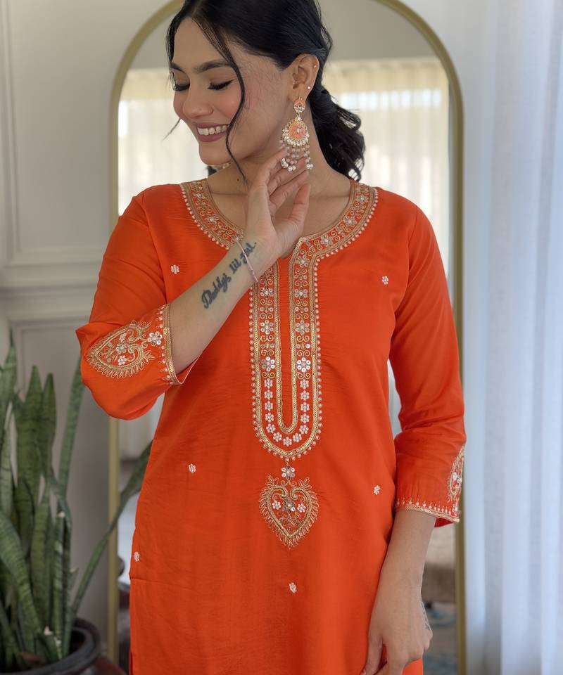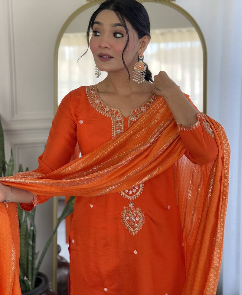 | Product Description | Step Into Vibrant Elegance With This Stunning Orange Kurta Pant Set For Women, Beautifully Crafted From Premium Viscose Chanderi Fabric That Offers A Soft Feel With A Subtle Festive Sheen. Designed With A Flattering V Neck, The Kurta Is Enhanced With Intricate Sequin And Stone Embroidery, Adding Refined Sparkle Perfect For Special Occasions. The Coordinated Tailored Pant Ensures A Sleek Silhouette, While The Rich Viscose Jacquard Dupatta Completes The Ensemble With Woven Texture And Graceful Drape. Blending The Timeless Beauty Of A Salwar Kameez With The Sophistication Of A Pakistani Suit, This Outfit Is Ideal As A Party Wear Kurta Set For Women. It Can Also Be Styled As An Anarkali Suit, Churidar Suit, Or Elegant Anarkali Kurties Look For Weddings, Diwali, Eid, Festive Celebrations, And Cultural Gatherings. This Versatile Salwar Suit Set With Dupatta Offers Comfort And Luxury, Making It A Must Have Designer Kurta Set For Your Ethnic Kurtis Collection. A Graceful Women's Indian Salwar Kameez Set, It Delivers Vibrant Color, Premium Craftsmanship, And Statement Embroidery For Standout Traditional Fashion. |