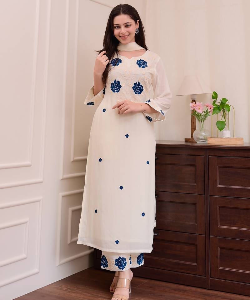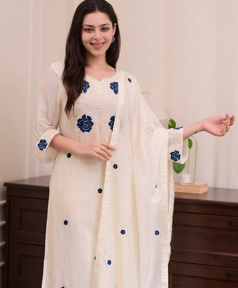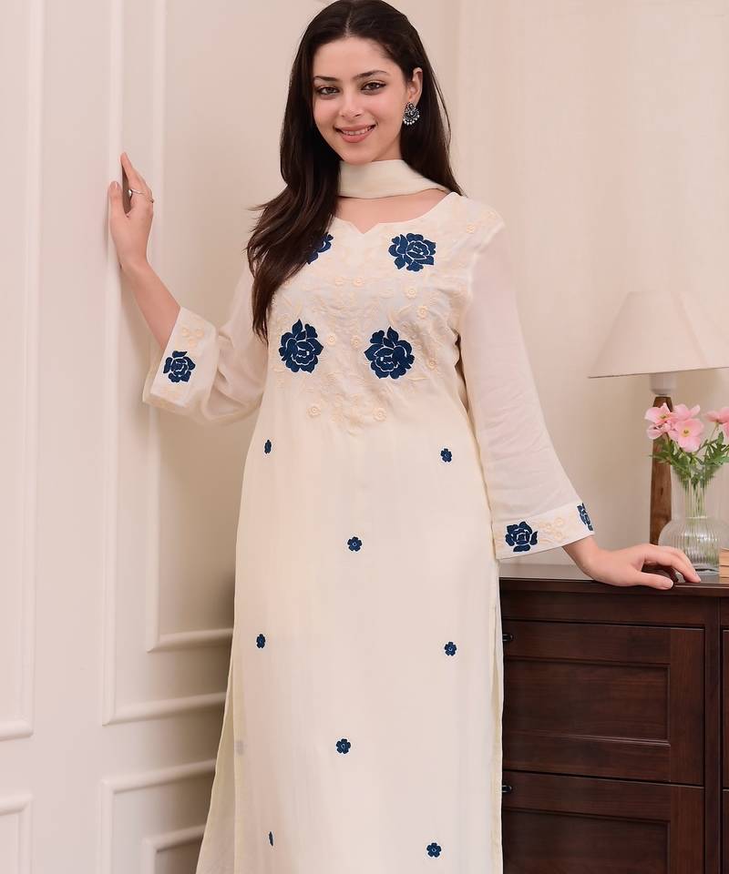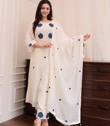 Women's white rayon slub sequin embroidered kurta pant set with chanderi dupatta