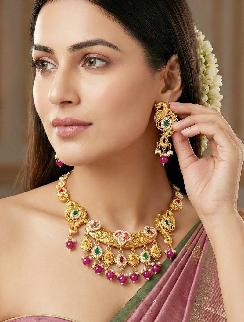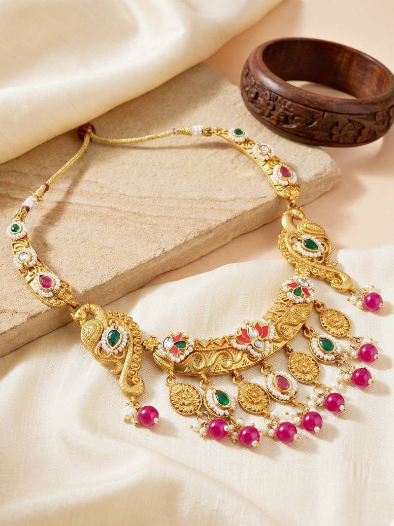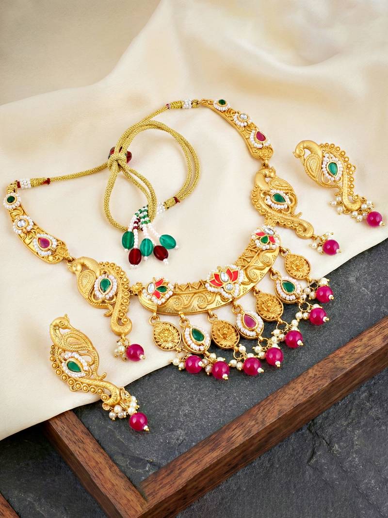 | Product Description | Celebrate Timeless Tradition With This Exquisitely Designed Peacock Temple Necklace Set From Lucky Jewellery. Crafted In A Rich Antique Gold Tone Finish, The Necklace Features Intricate Peacock Motifs, Detailed Temple Inspired Elements, And Elegant Stone Work That Reflect Classic Indian Craftsmanship. Accented With Colored Stones, Moti Highlights, And Graceful Bead Drops, This Necklace Set Adds Movement And Regal Charm To Your Look. The Matching Earrings Complement The Necklace Perfectly, Making This Set Ideal For Weddings, Bridal Functions, Festive Occasions, And Cultural Celebrations. Designed To Pair Beautifully With Silk Sarees, Bridal Lehengas, Traditional Outfits, And Ethnic Wear, This Jewellery Set Offers A Grand Yet Balanced Appearance, Making It A Standout Choice For Special Occasions And Gifting. |